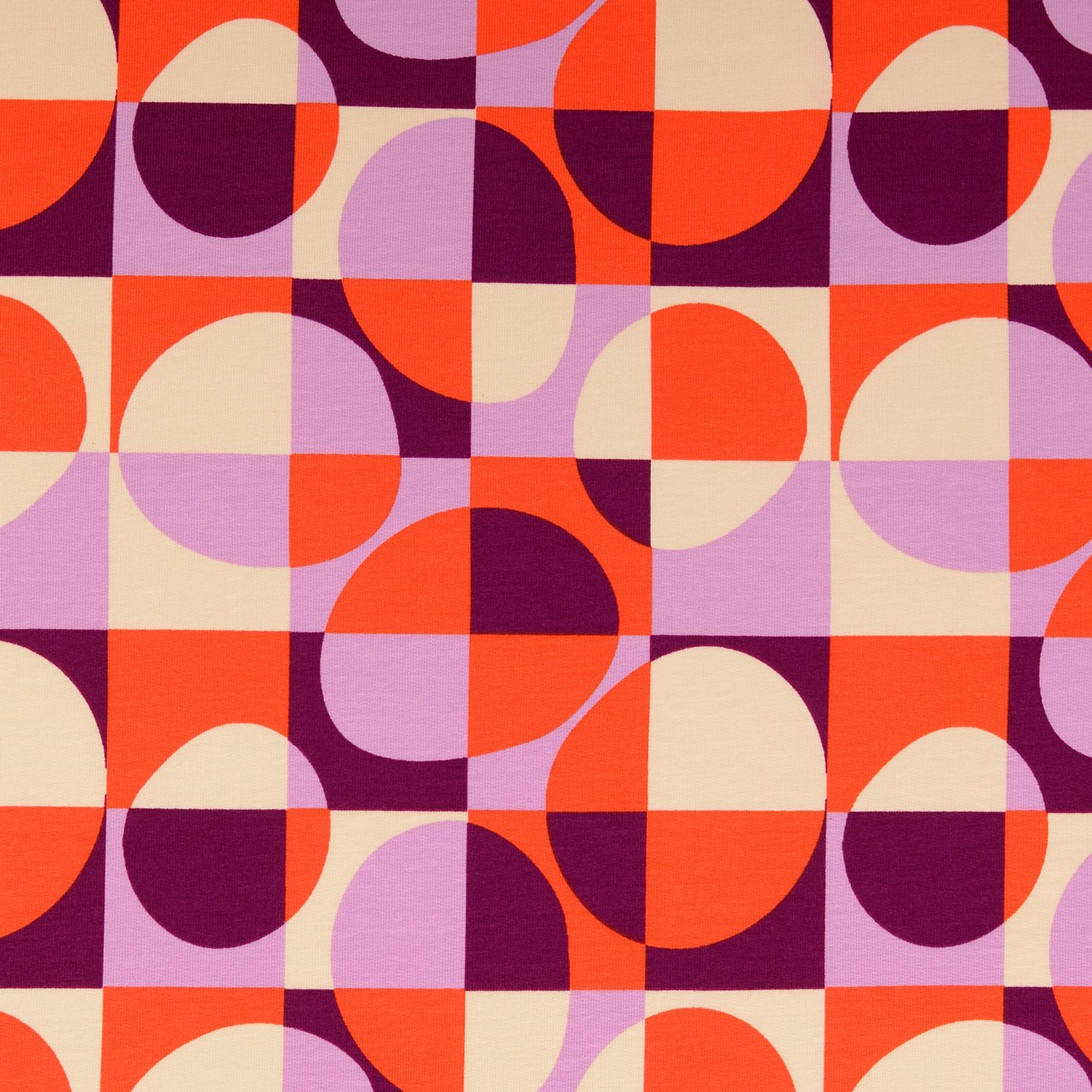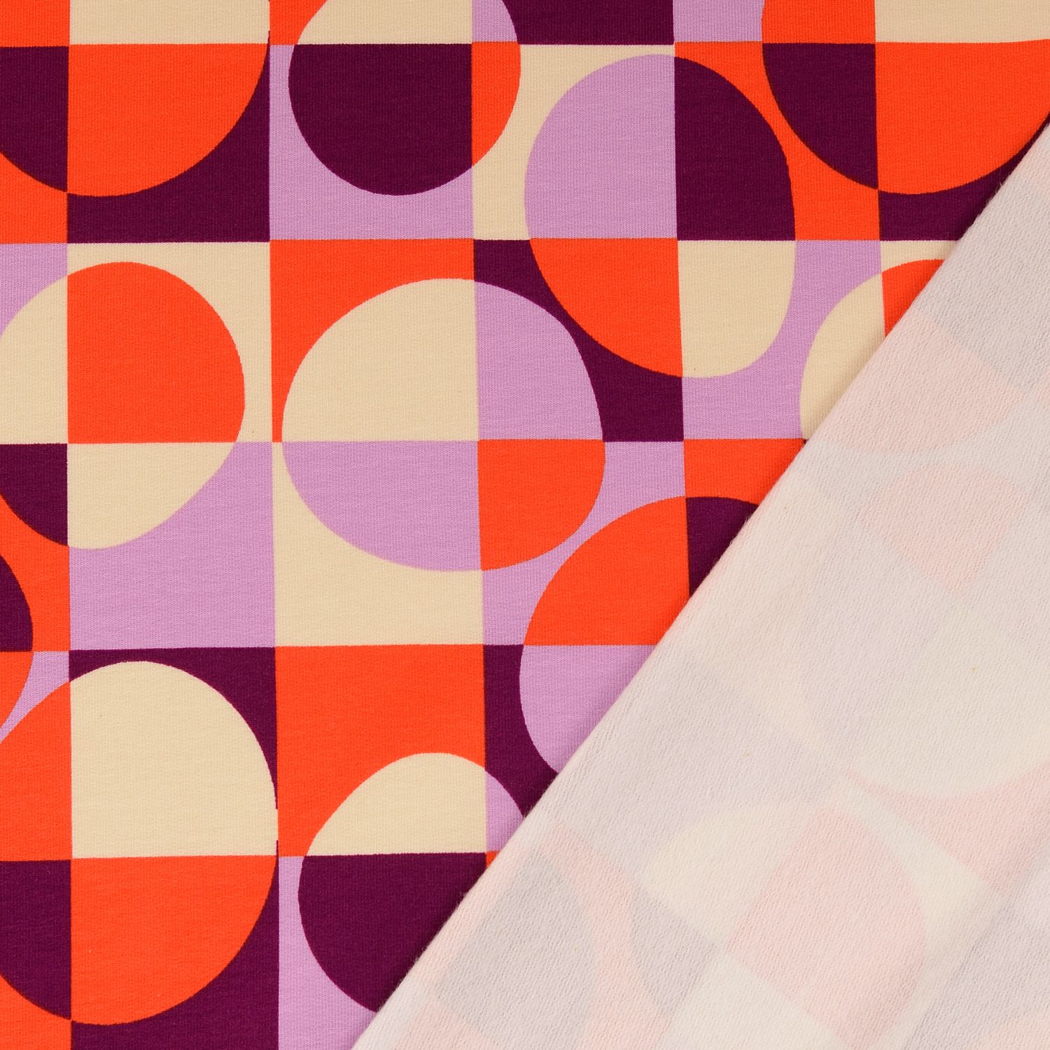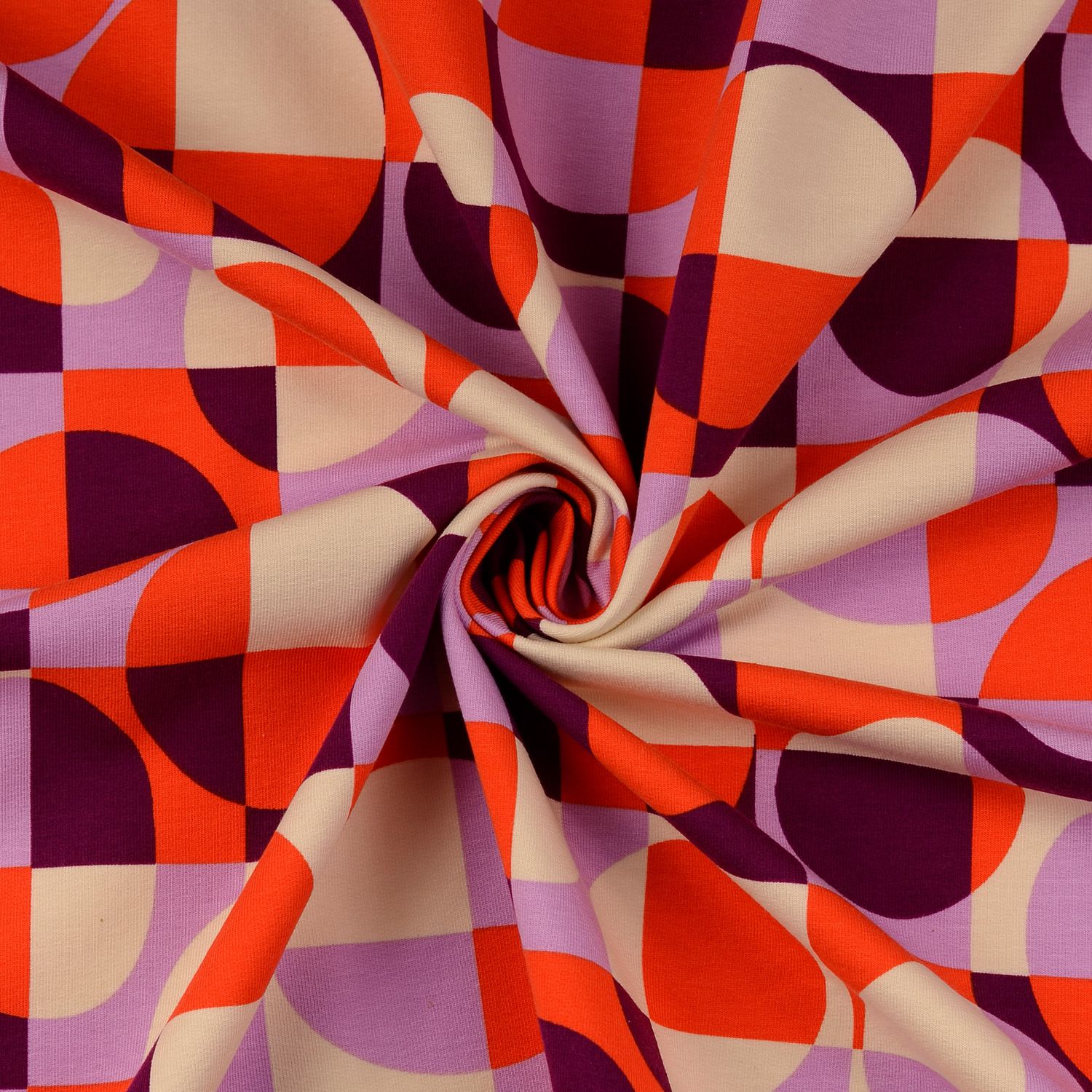 Tämä pehmeä French Terry hurmaa nostalgisella retrodesignillaan hennon liilan sävyissä. Leikkisät, graafiset kuviot liilassa, violetissa ja pehmeissä pastellisävyissä yhdistyvät miellyttävästi karhennettuun taustaan, joka huokuu välittömästi kodikkuutta.