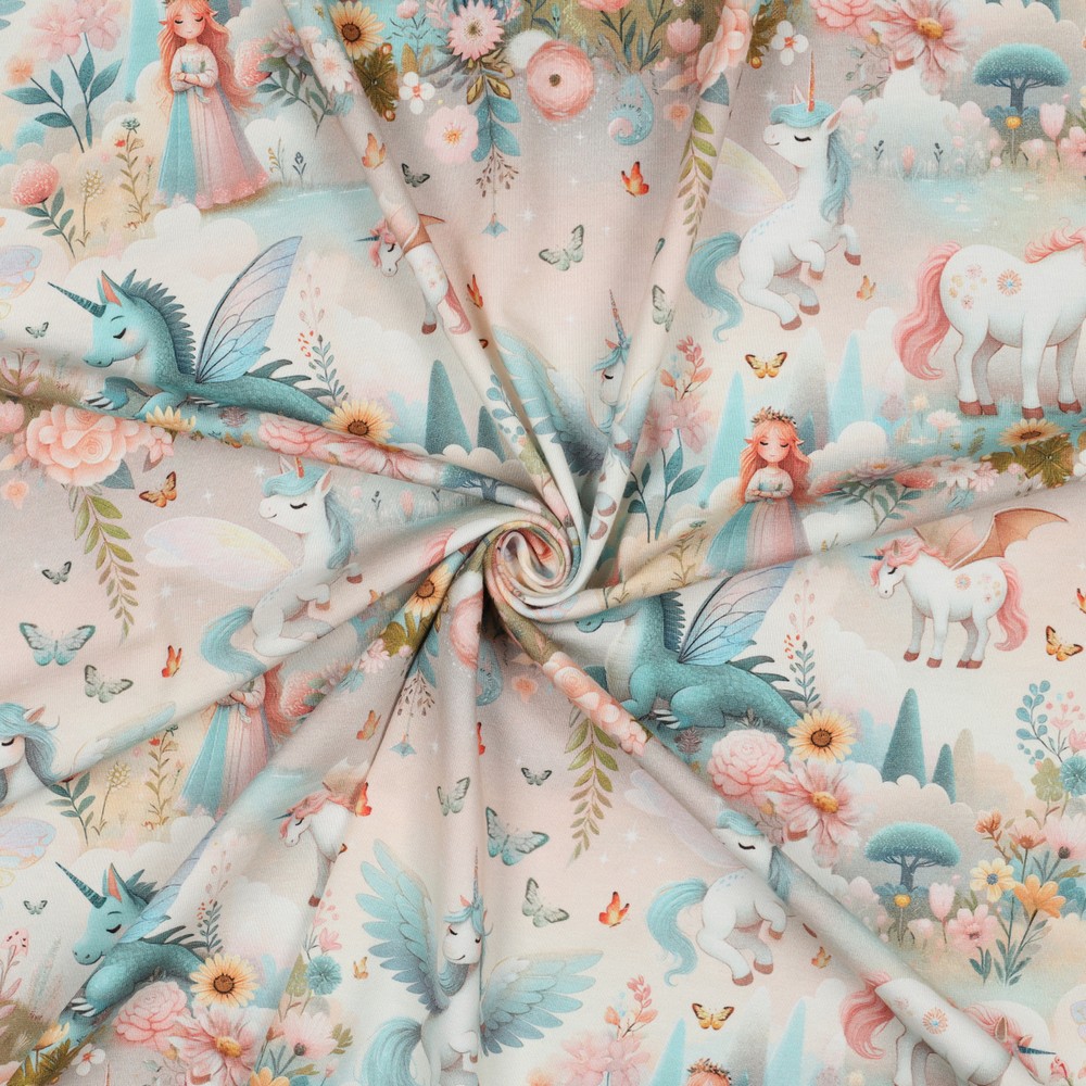 Herkkä väriunelma ompeluprojekteihisi: Tämä trikoo loistaa pehmeiden pastellivärien harmonisessa yhdistelmässä. Ruusunvärinen, lila, vaaleansininen, minttu ja keltaisen lämpimät sävyt sulautuvat pehmeästi toisiinsa kuin akvarellilla maalattuina, mikä luo eloisan mutta rauhallisen ilmeen.