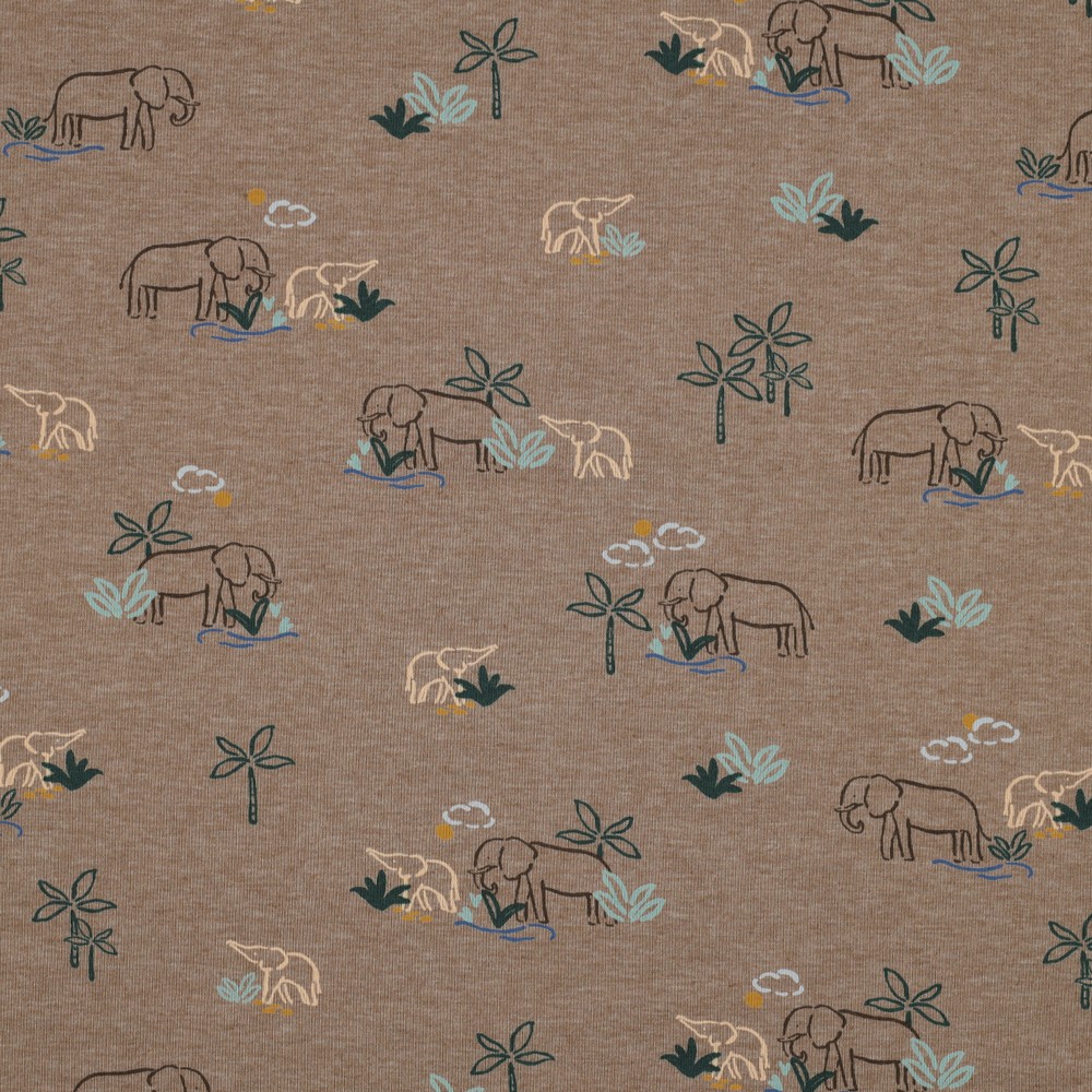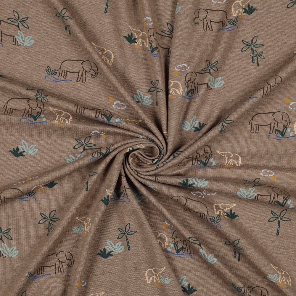 Tämä ihastuttava melange taupe -jersey hurmaa suloisella elefanttikuviollaan. Pienet elefantit ovat hillityn tumman taupen sävyssä ja levittyvät tasaisesti kevyesti rakenteelliselle taustalle. Näin syntyy harmoninen, rauhallinen kokonaisuus, joka kuitenkin on iloinen ja lapsellinen.