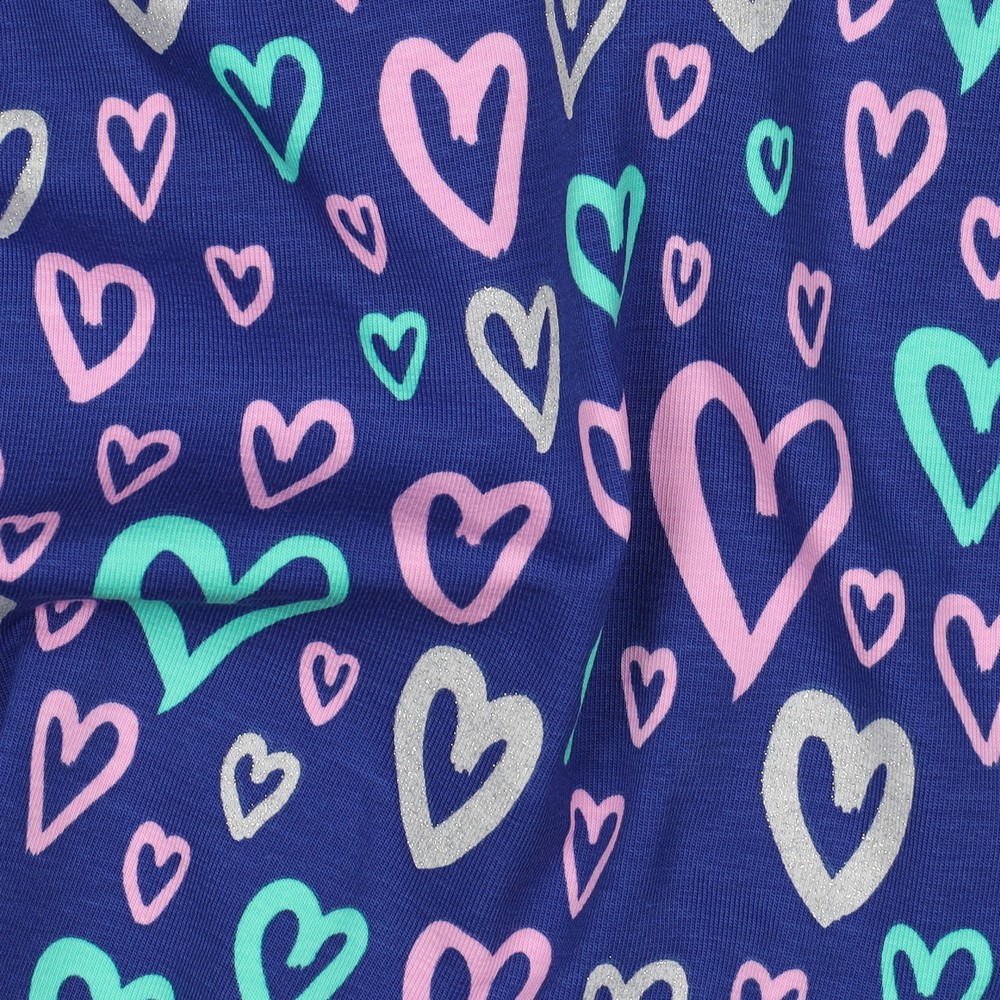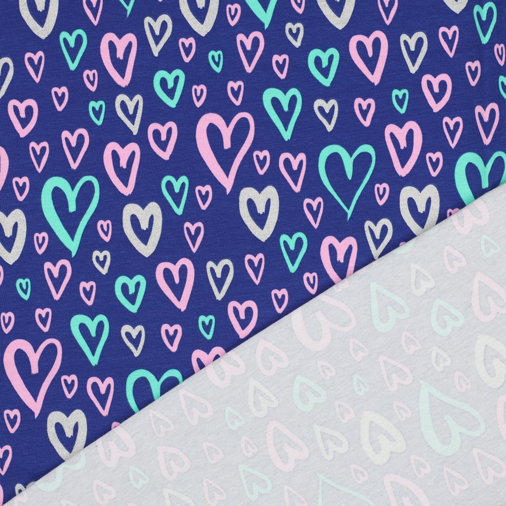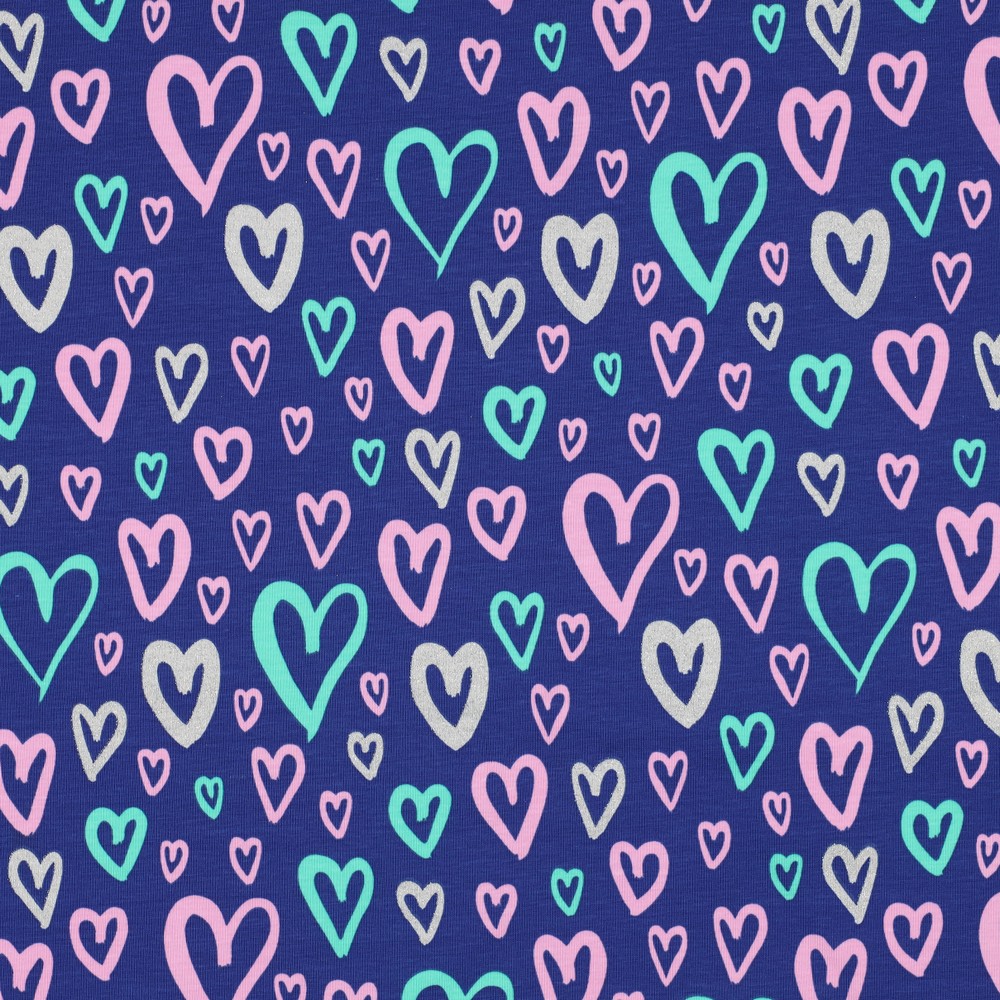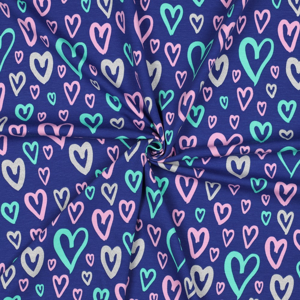Olipa kyseessä näyttävä allover-kuosi tai yhdistetty yksivärisiin kankaisiin: Jersey – Sydämet Kimallus Koboltti saa jokaisen ompeluprojektin loistamaan.