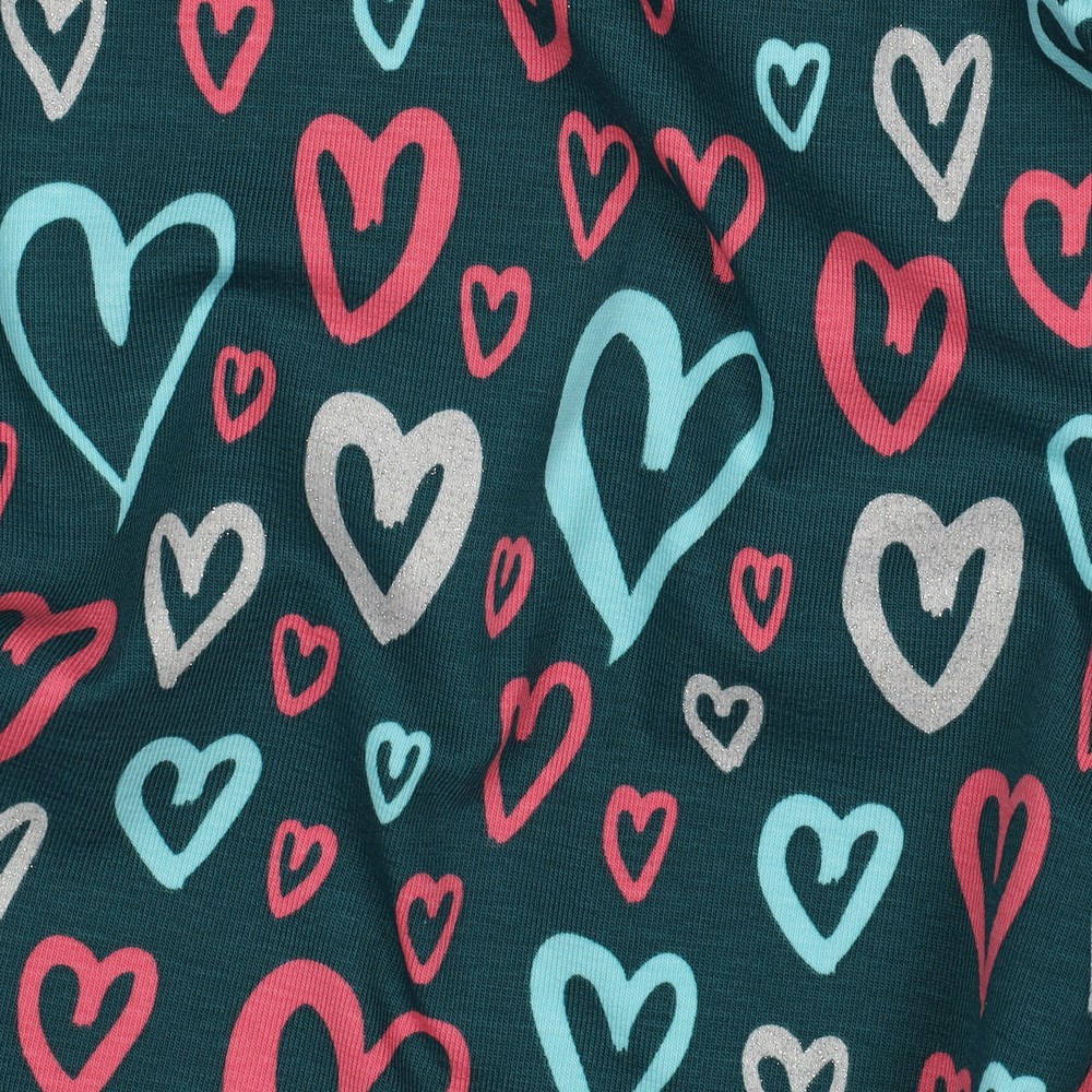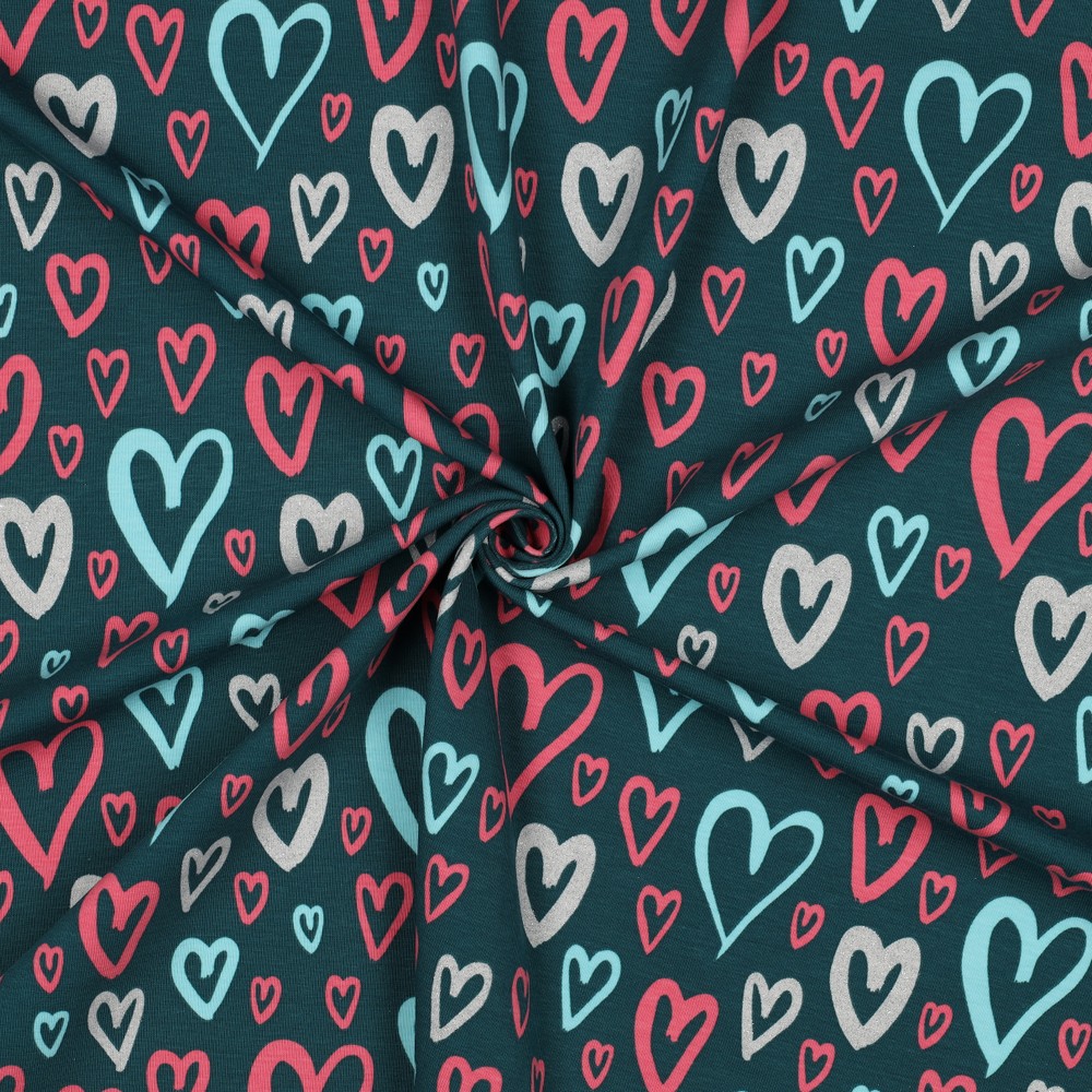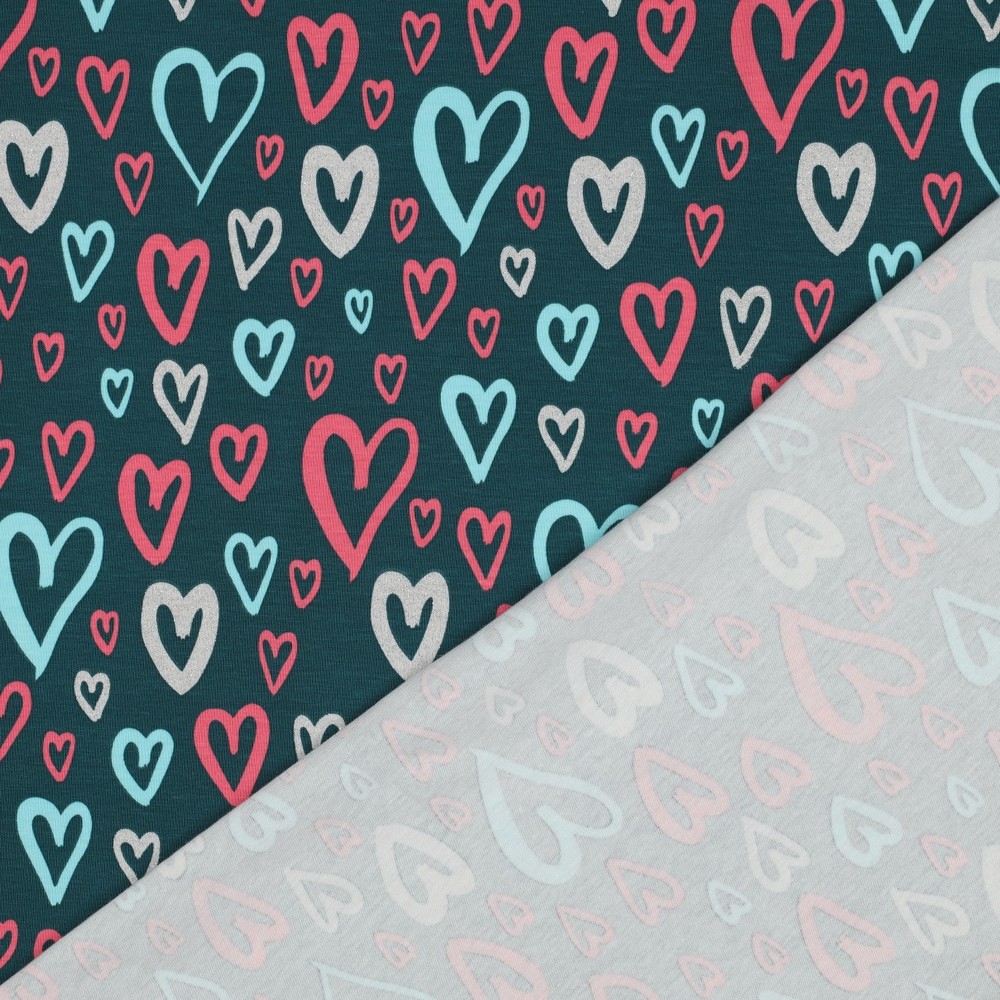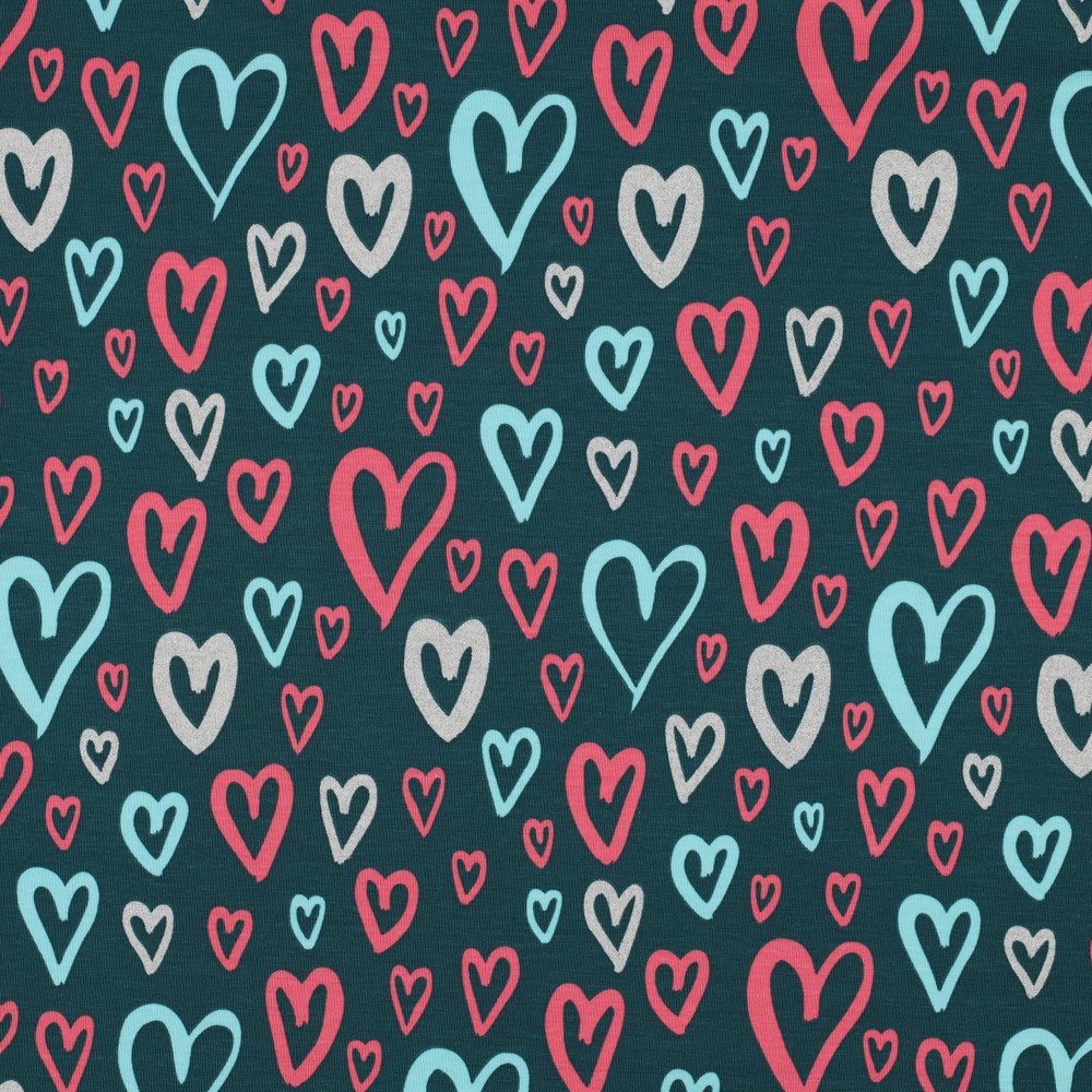 Olipa kyse suloisista paidoista, mukavista mekoista, legginsseistä, hameista tai suosikkikotoiluvaatteista: Tämä jersey tekee jokaisesta ompeluprojektista todellisen katseenvangitsijan. Kimaltavat sydämet tulevat kauniisti esille erityisesti lasten ja naisten vaatteissa, mutta ne sopivat myös hyvin asusteisiin kuten pipoihin, tuubihuiveihin tai hiuspantoihin.