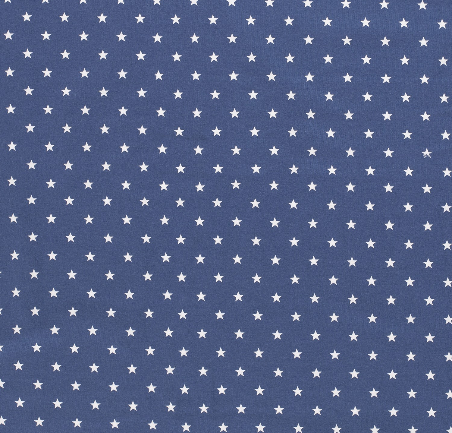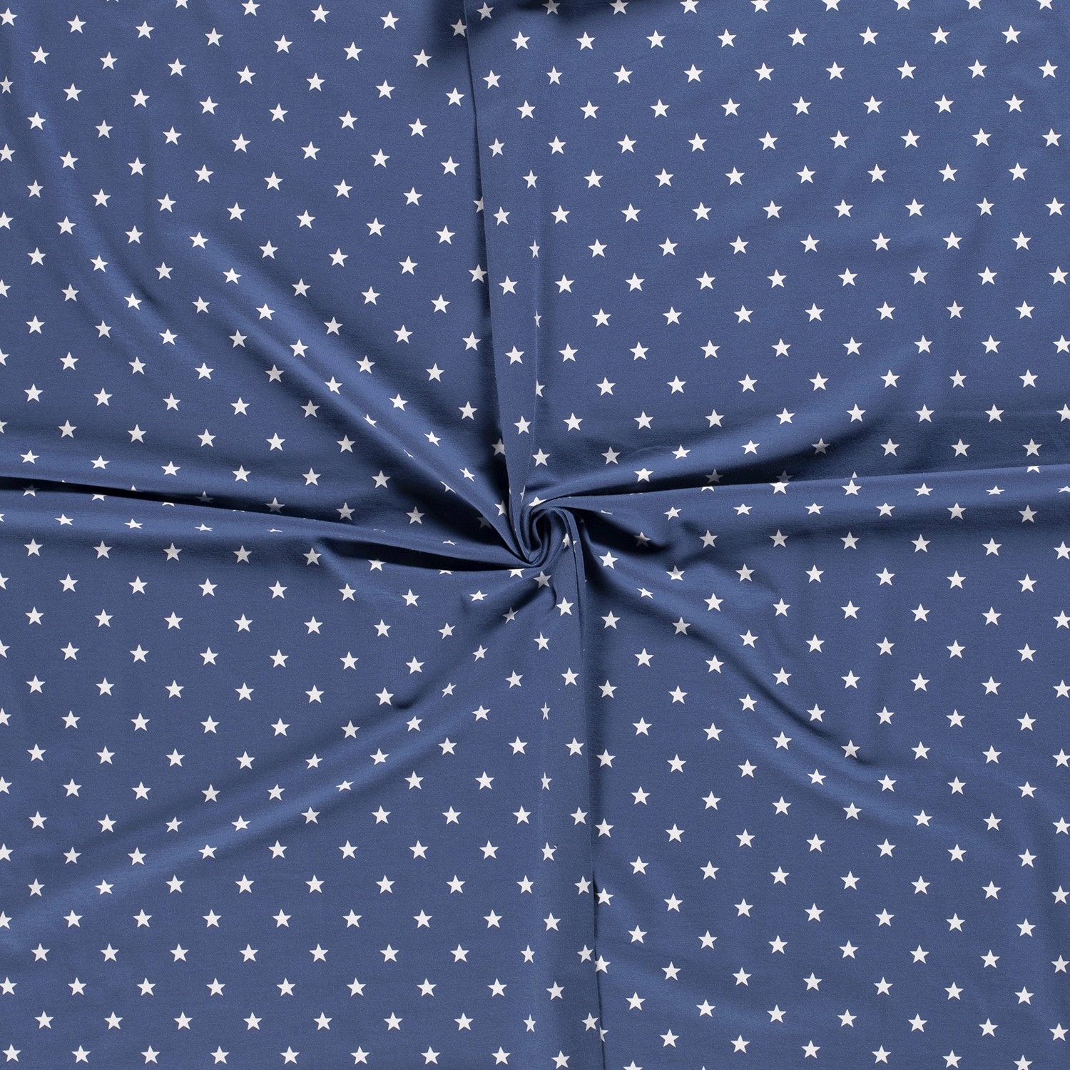 Taivaallisen kaunis jersey: Savunsinisellä pohjalla tanssii pieniä, tasaisia tähtiä, jotka antavat kankaalle hennon, leikkisän ilmeen. Hienovaraisesti kontrastoivat tähdet näyttävät moderneilta ja samalla ajattomilta – täydelliset niille, jotka pitävät yksinkertaisista kuoseista rakkaudella tehdyillä yksityiskohdilla.
