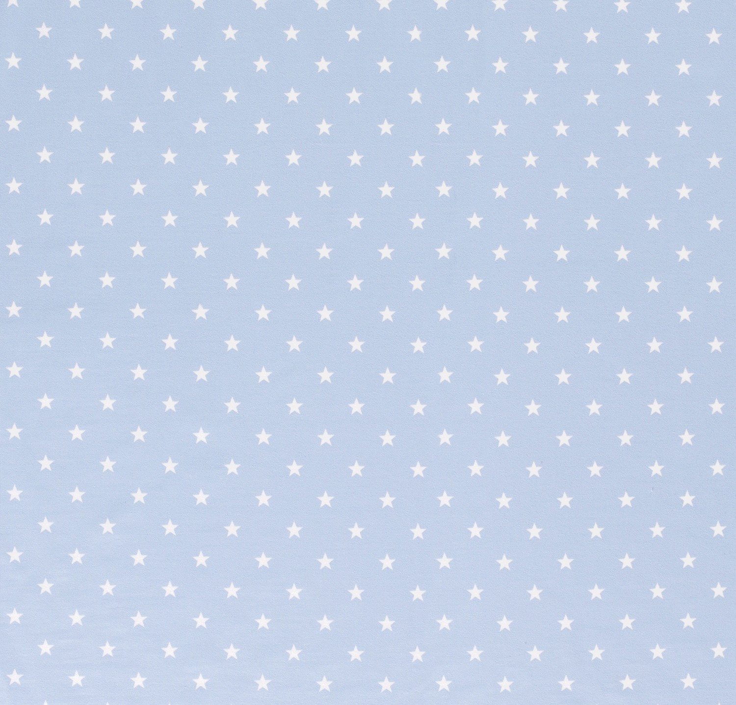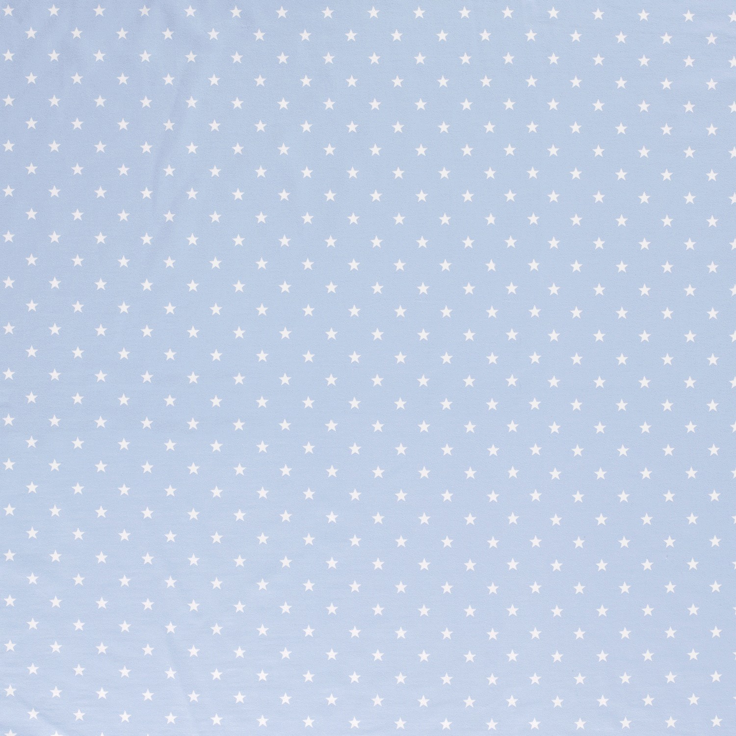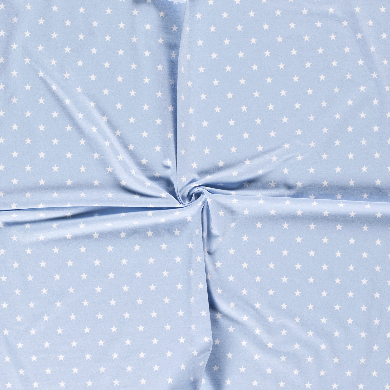 Taivaansininen jersey, joka on täynnä pieniä, tasaisia tähtiä – kuin kirkas tähtitaivas kankaan muodossa. Hienot valkoiset tähdet erottuvat kauniisti pehmeällä vaaleansinisellä ja luovat samalla iloisen ja rauhoittavan vaikutelman.