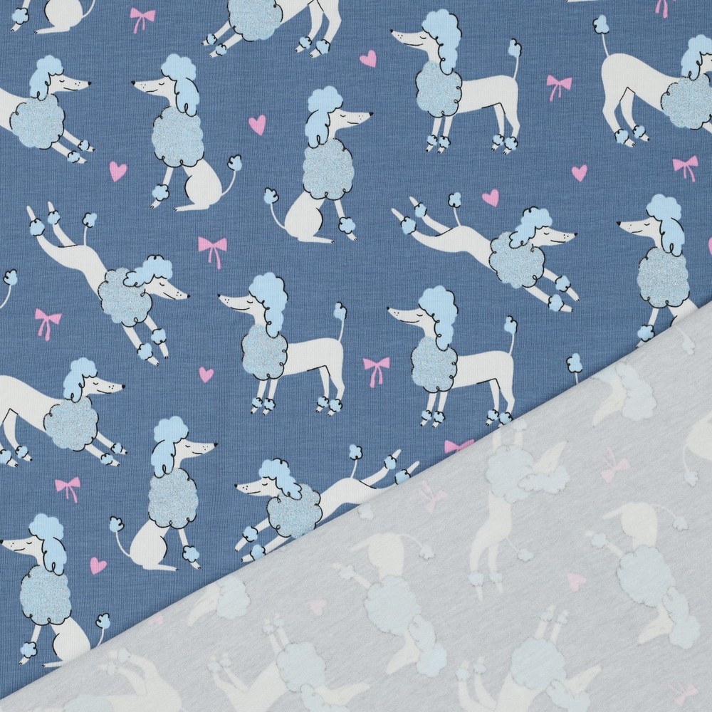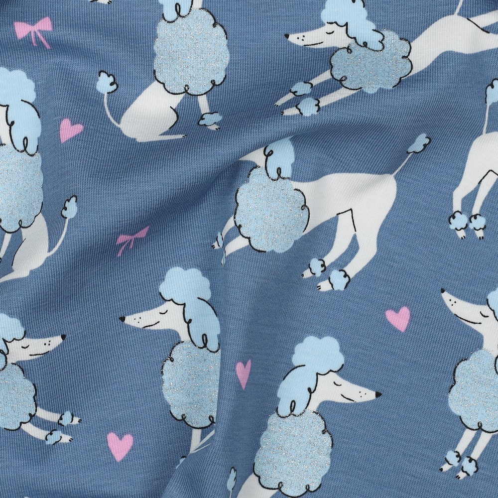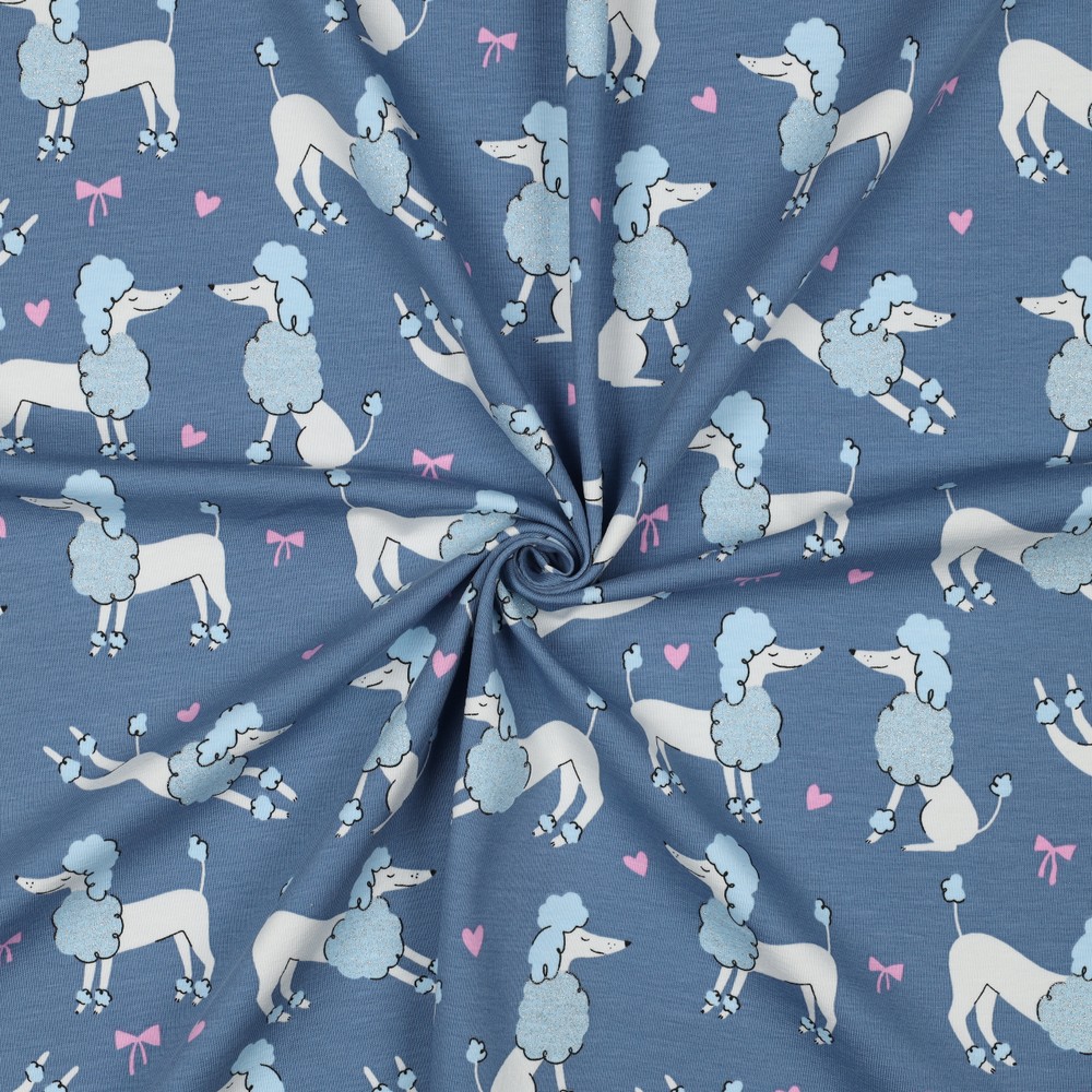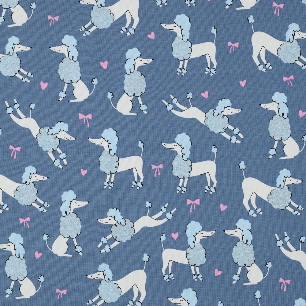 Rakastettava kangas: Farkunsinistä taustaa vasten astelee ihastuttavia villakoiria, jotka on viimeistelty hienoilla kimaltavilla yksityiskohdilla. Suloiset koirat on kuvattu rakkaudella – pörröisellä turkilla, suloisilla kasvoilla ja pienillä asusteilla, jotka tekevät niistä todellisia katseenvangitsijoita. Hillitty kiilto antaa kuviolle leikkisän mutta silti hienostuneen sävyn ilman, että se on päällekäyvä.
