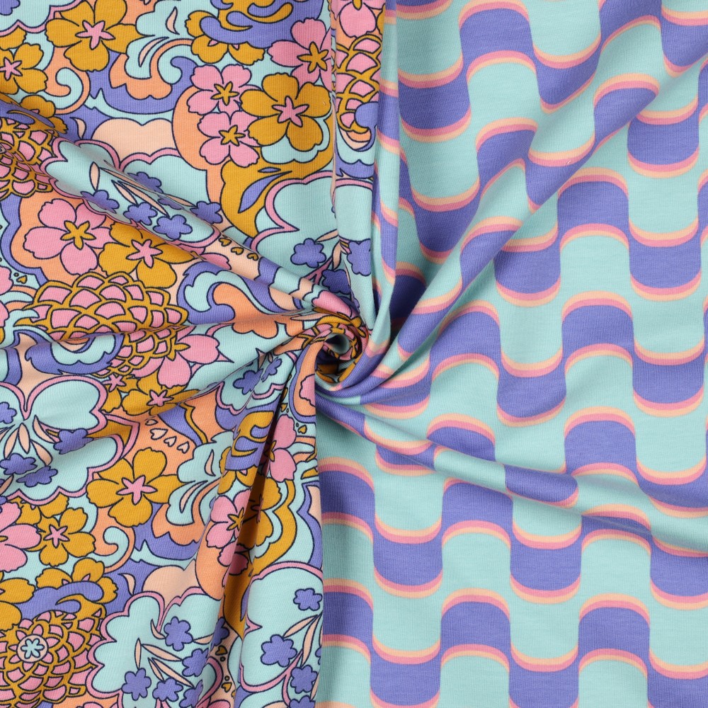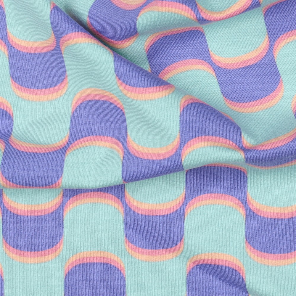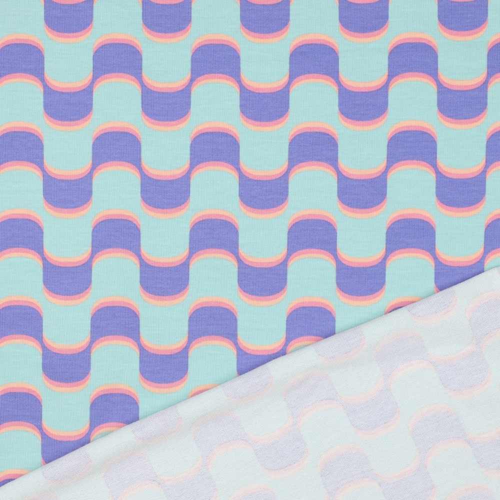 Tämä French Terry hurmaa pehmeällä vaaleansinertä ja kermanvärisellä retroaaltokuvioinnilla, joka tuo mieleen meren, rannan ja aurinkoiset lomapäivät. Pehmeät, virtaavat linjat ovat harmonisia ja rauhoittavia – täydellinen niille, jotka rakastavat yksinkertaisia kuvioita erityisellä viehätysvoimalla.