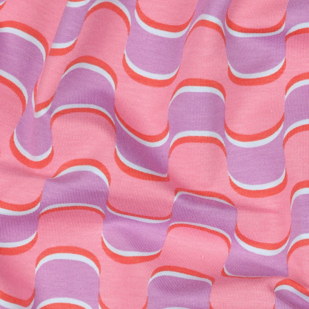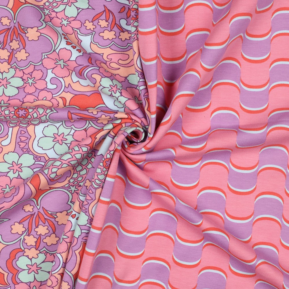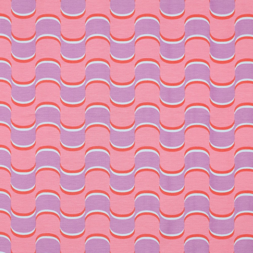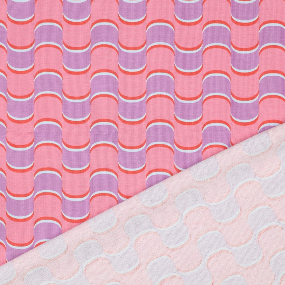 Herkät retrovibat kohtaavat modernin keveyden: Tämä kesä-sweat hurmaa aaltoilevalla kuviolla hennon liilan sävyissä, yhdistettynä hienoihin vaaleanpunaisen, kerman ja hillityn beigen vivahteisiin. Kaarevat linjat muistuttavat tyyliteltyjä aaltoja tai pehmeitä kukkuloita, ja ne antavat jokaiselle ompeluprojektille harmonisen, kevyesti leikittelevän ilmeen.