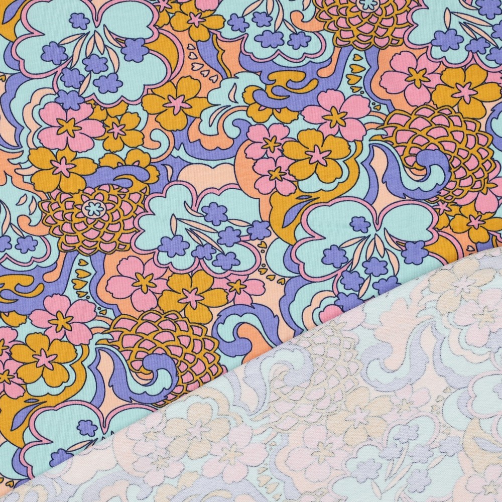 Kesäsweat - French Terry yhdistelmäkangas Retro kukat vaaleansininen