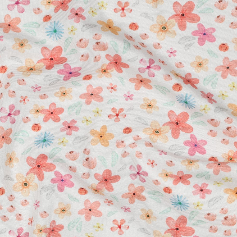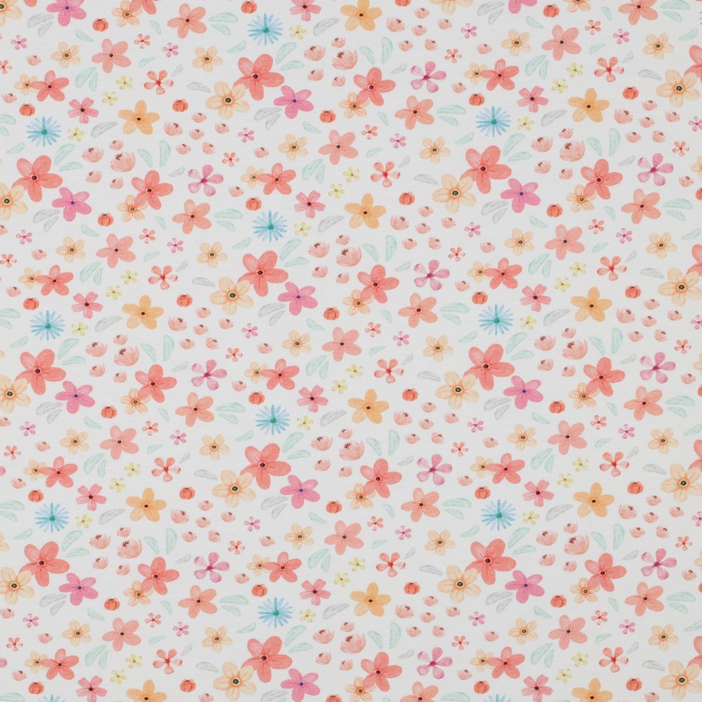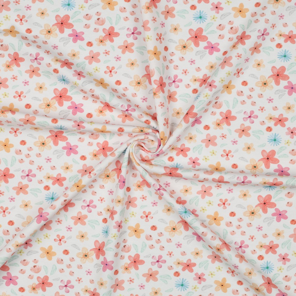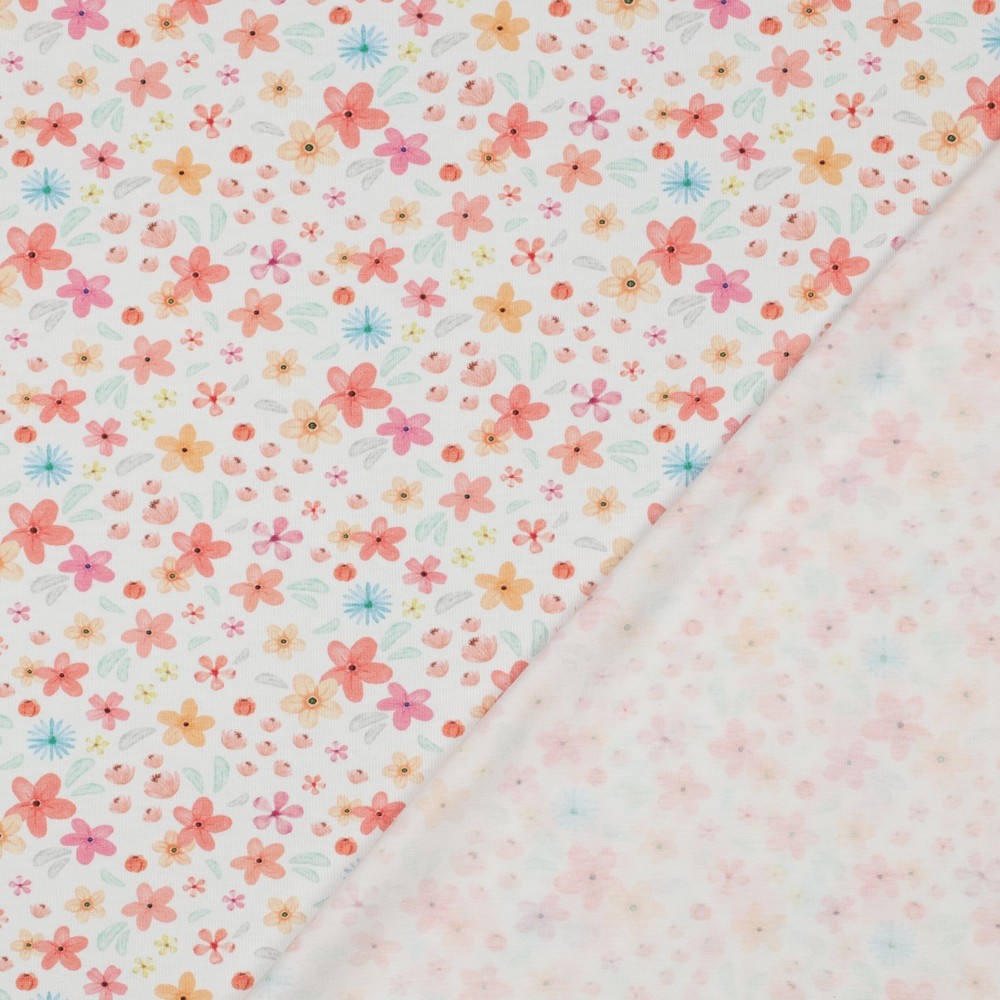 Herkän kukkainen unelma kirkkaan valkoisella taustalla: Tämä kaunis jersey esittää hienovaraisen kukkakuvion pehmeissä, luonnollisissa väreissä. Hienovaraiset roosa- ja vanhan roosan sävyt kohtaavat hillittyä vihreää ja lämmintä okran sävyä – kuin vastaleikattu niityn kimppu, rakkaudella kankaalle ikuistettuna.