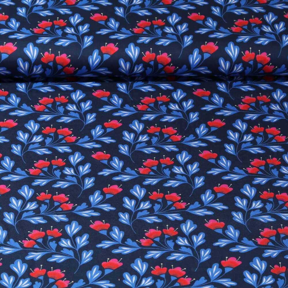 Tämä upea satiinikangas lumoaa modernilla, graafisella kukkakuvioinnilla raikkaan sinisissä sävyissä. Herkät terälehdet, tyylitellyt lehdet ja hienot viivat tanssivat hienostuneella laivastonsinisellä pohjalla luoden eloisan mutta harmonisen kokonaisuuden.