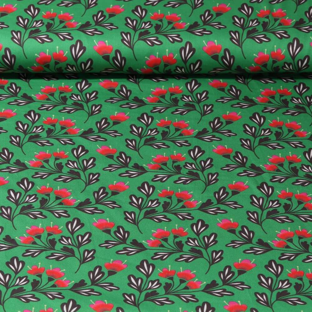 Tämä unenomainen satiini lumoaa ensi silmäyksellä: Sinisen ja turkoosin eri sävyjä olevat hennot kellonmuotoiset kukat tanssivat raikkaan, rehevän vihreän sävyn päällä. Hienot yksityiskohdat ja elinvoimainen digitaalipainatus saavat kukkakuvion näyttämään lähes maalatulta - modernilta, iloiselta ja silti ihanan tyylikkäältä.