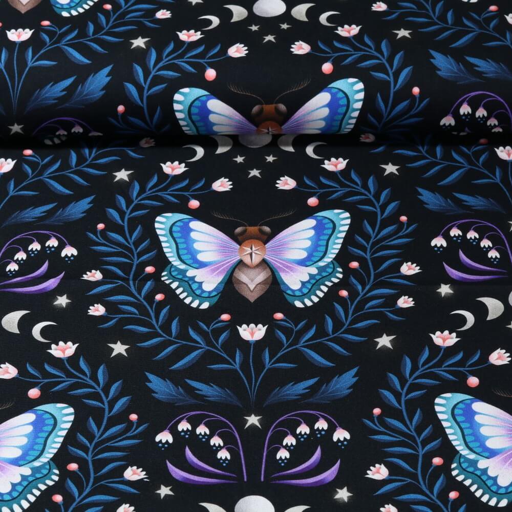 Taitavasti piirretyt koiperhoset näyttävät melkein kuin pieniltä jalokiviltä yön pimeydessä ja antavat kankaalle tyylikkään, hieman mystisen auran. Hienovarainen, toistuva kuviointi tekee kankaasta monikäyttöisen - tyylikkäistä vaatteista ja erityisistä asusteista aina tyylikkäisiin kodin sisustusprojekteihin.