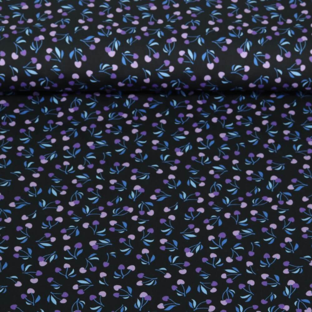Tämä tyylikäs puuvillasatiinikangas viettelee hedelmäisellä kirsikkakuvioinnilla syvällä mustalla pohjalla. Kirkkaanpunaiset kirsikat, joissa on hennot vihreät varret, näyttävät juuri poimituilta, ja ne pääsevät parhaiten esille hienon satiinihohteen ansiosta.
