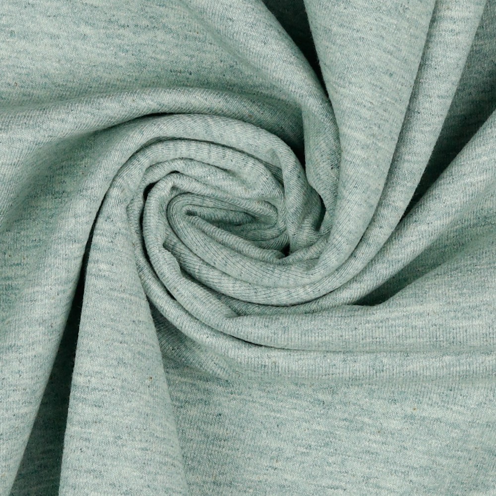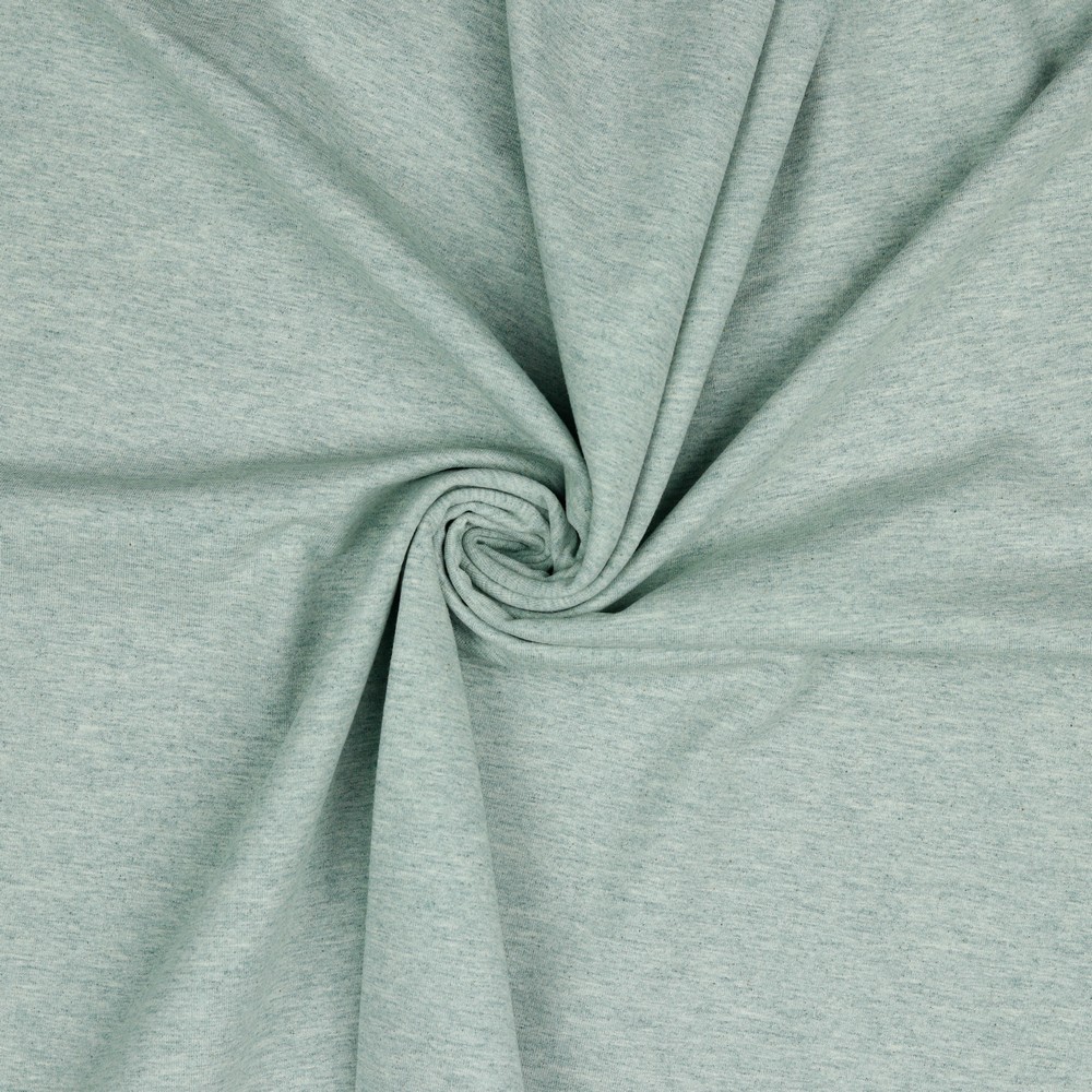 Raikas vivahde ompeluprojekteihisi: Tämä mintun sävyinen jersey hurmaa hienostuneella melange-kuviolla, jossa vaaleat ja hieman tummemmat kuidut sulautuvat harmonisesti. Näin syntyy eläväinen, kevyesti marmoroitu ilme, joka antaa yksiväriselle kankaalle persoonallisen säväyksen.