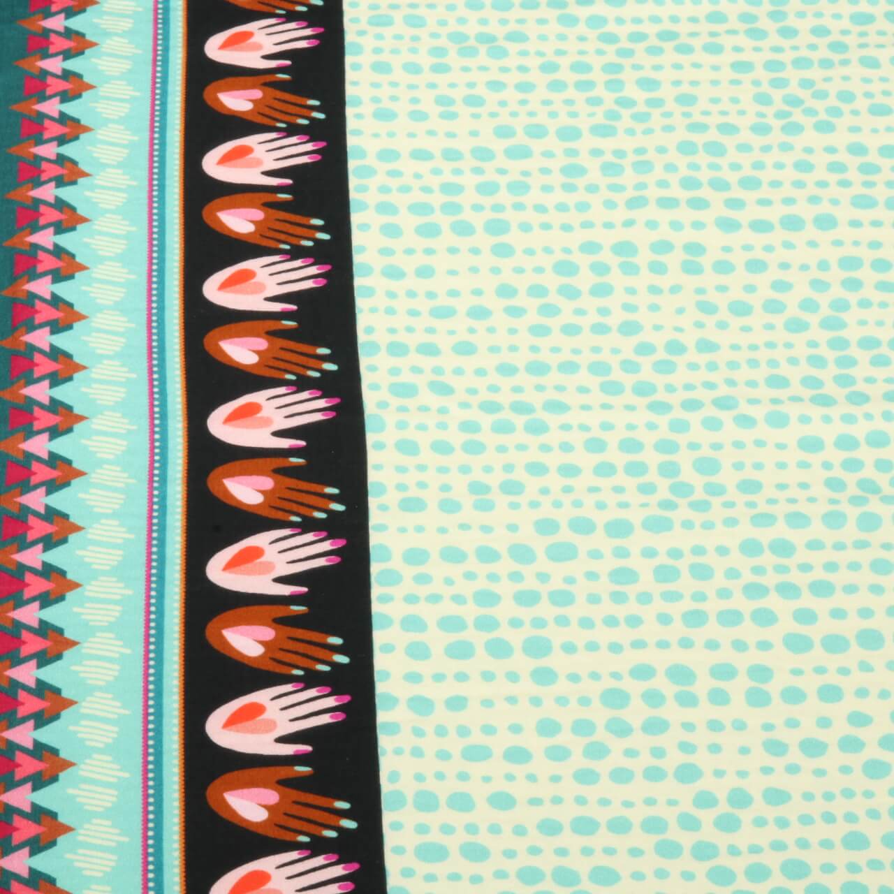 Värikkäät, tyylitellyt päät ovat rivissä pehmeällä, ecruskealla pohjalla: eri ihonvärit, hiusvärit ja kampaukset, joillakin kruunut, huivit tai aurinkolasit - jokainen hahmo on ainutlaatuinen ja silti osa vahvaa yhteisöä. Elävät värit, kuten vaaleanpunainen, sinapinkeltainen, petrooli, oranssi ja musta, luovat eloisia korostuksia ja tekevät kankaasta iloisen katseenvangitsijan.