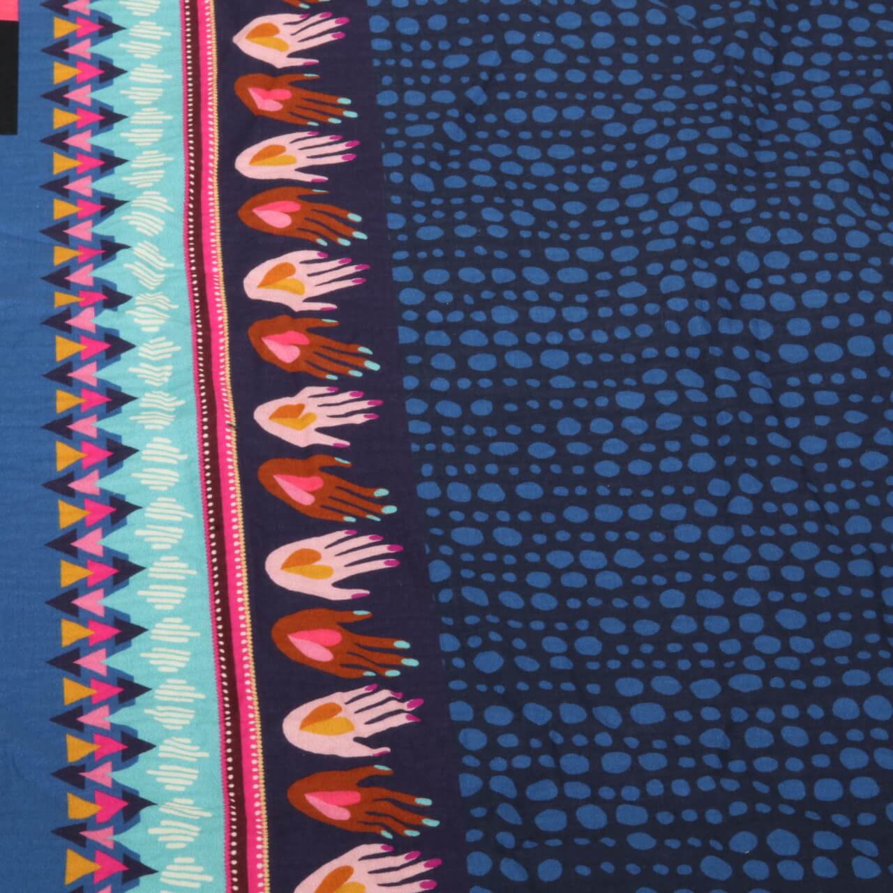 Tämä upea musliini juhlistaa monimuotoisuutta, voimaa ja yhtenäisyyttä. Tyylitellyt naisten päät loistavat rohkeissa väreissä eloisalla sinisellä pohjalla: lämmin oranssi, täyteläinen punainen, pehmeä vaaleanpunainen, kirkkaan keltainen ja mustavalkoiset korostukset luovat modernin, graafisen mallin, jolla on statement-luonne.