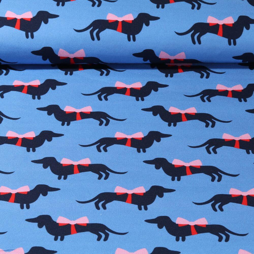Kangas, johon voi rakastua - ja jolle voi hymyillä: tyylikkäät, wieniläisen näköiset mäyräkoirat kulkevat tällä korkealaatuisella kankaalla rikkaalla, syvänsinisellä taustalla. Pienillä koirilla on yllään rakkaudella suunnitellut takit, huivit ja asusteet, jotka loistavat iloisissa väreissä, kuten keltaisessa, oranssissa, punaisessa ja vaaleanpunaisessa, ja antavat kuviolle leikkisän, modernin retrohenkisen viehätyksen.