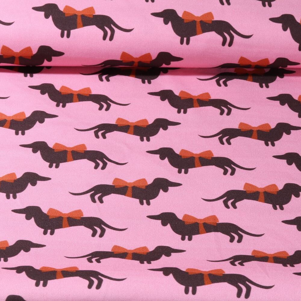 Kangas, johon voi rakastua: Tällä lumoavalla kankaalla pikku koirat pörräävät rennon sarjakuvamaisesti hennon vaaleanpunaisen sävyn päällä. Koirilla on röyhkeät aurinkolasit, värikkäät huivit ja paljon "bling blingiä" - kultaiset yksityiskohdat, pienet tähdet ja leikkisät kuviot tekevät kankaasta todellisen katseenvangitsijan.
