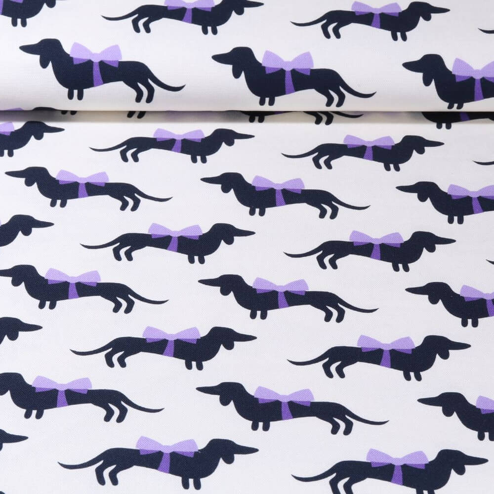 Kangas, johon rakastua - ja jolle hymyillä! Tyylikkäät wieniläistyyliset mäyräkoirat kulkevat kirkkaanvalkoisella pohjalla, joka on kuvattu rakastavasti tyypillisellä kuvioinnilla. Pienillä nelijalkaisilla ystävillä on yllään värikkäitä takkeja, huiveja ja asusteita iloisissa väreissä, kuten sinapinkeltaisessa, vaaleanpunaisessa, turkoosissa, petroolissa ja ruskean lämpimissä sävyissä. Hienovaraiset pisteet, pienet tähdet ja graafiset yksityiskohdat tuovat leikkisät korostukset ja elävöittävät kuviota.