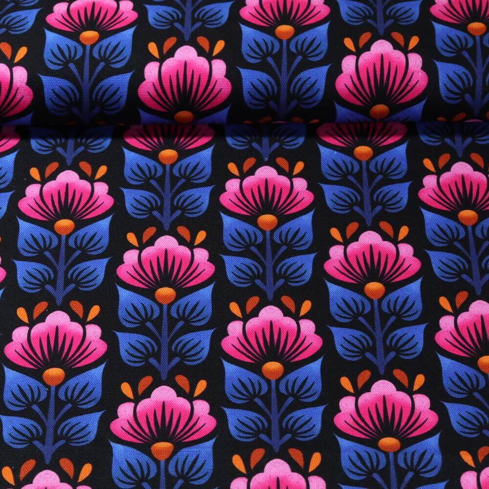 Digitaalipainatuksella varustettu korkealaatuinen kangas sopii kaikkeen, minkä on erotuttava edukseen: laukkuihin, reppuihin, kosmetiikkalaukkuihin, tyynyihin, kodin sisustukseen tai vankkoihin asusteisiin. Tumma tausta saa kirkkaat värit erottumaan erityisen hyvin ja tekee mistä tahansa ompeluprojektista todellisen statement-kappaleen.