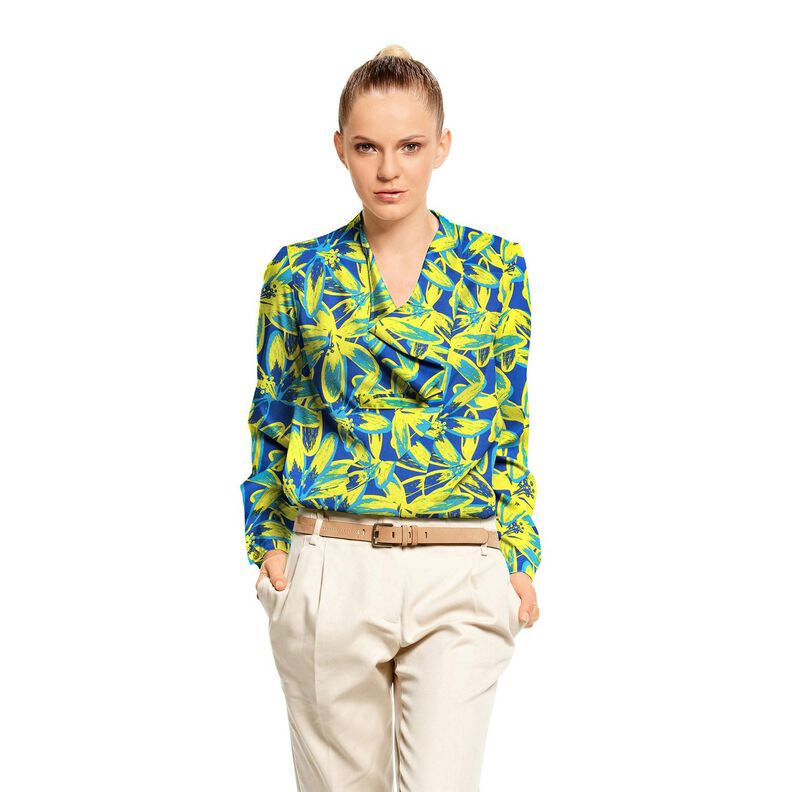 Kreppisatiini Suuret kamomillan kukat – indigo/sitruunankeltainen