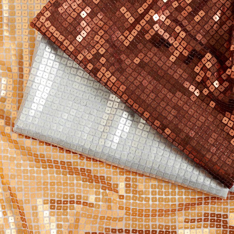 Paljeteilla taidokkaasti kirjailtu kangas lumoaa tyylikkyydellä ja glamourilla, se sopii ihanteellisesti juhlavaan iltamuotiin ja upeisiin ompeluideoihin.