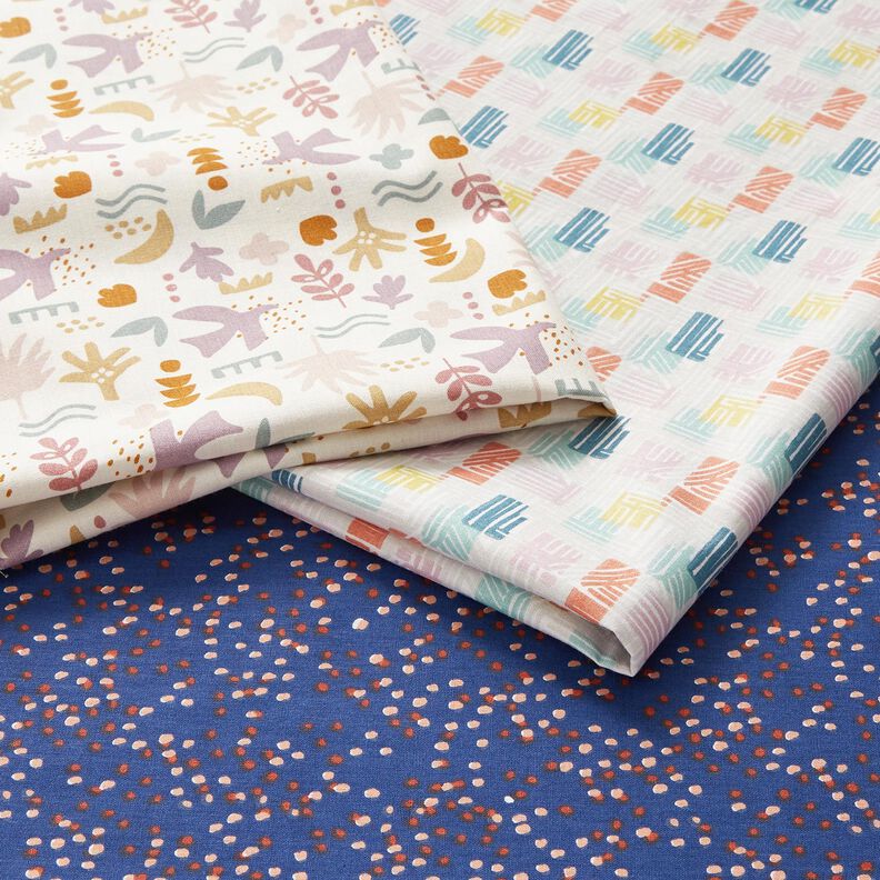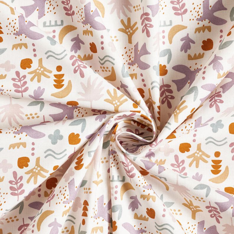 Puuvillakangas Kretonki Abstraktit linnut – villanvalkoinen/pastellivioletti