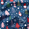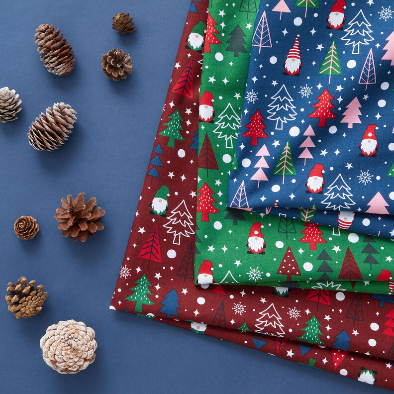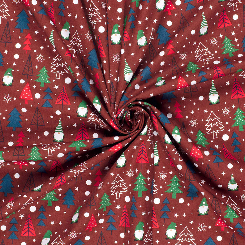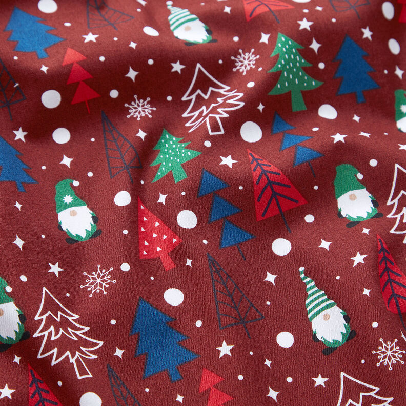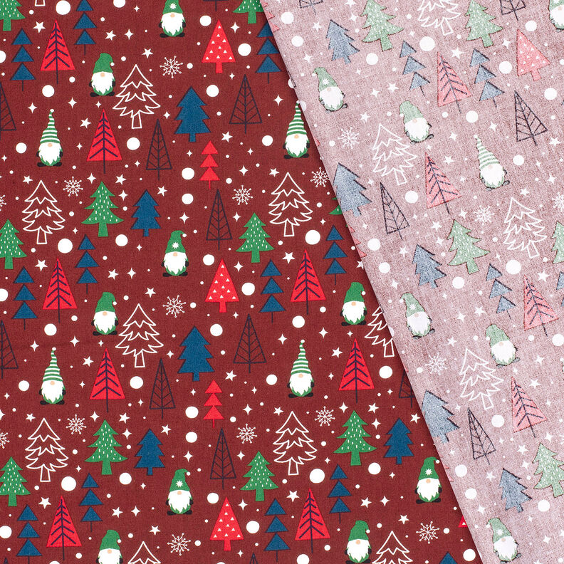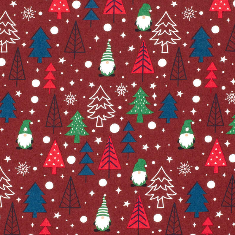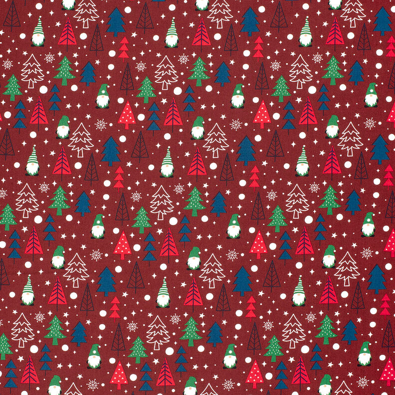 Puuvillakangas Popliini Tontut ja kuuset – tummanpunainen