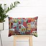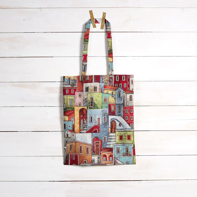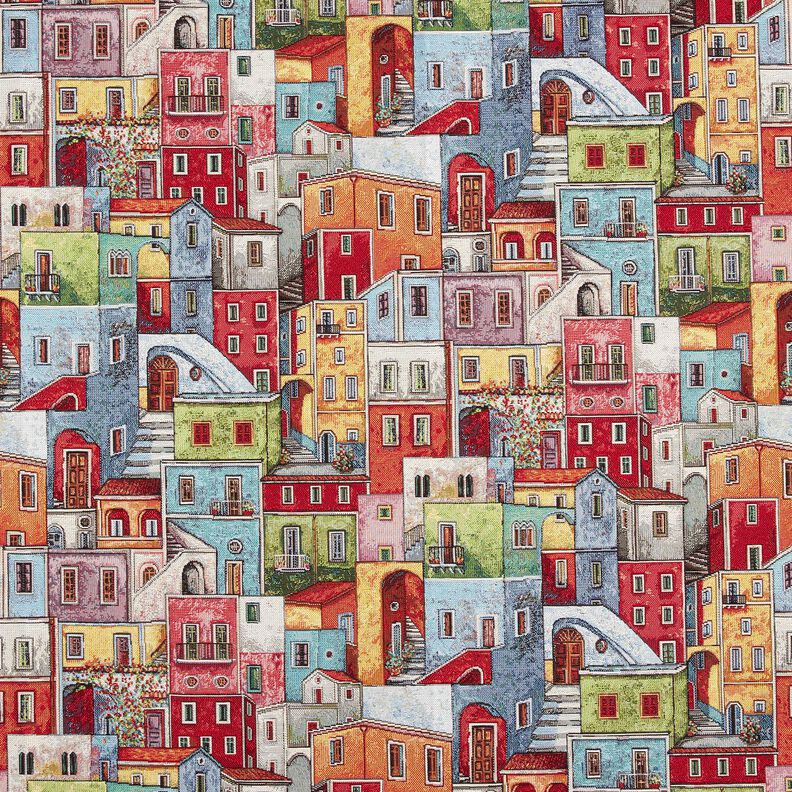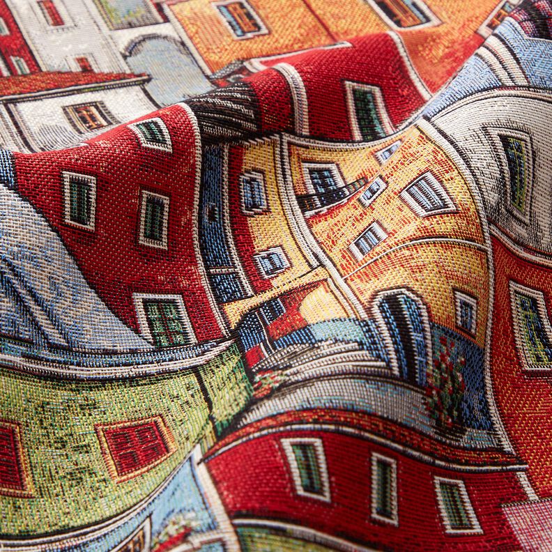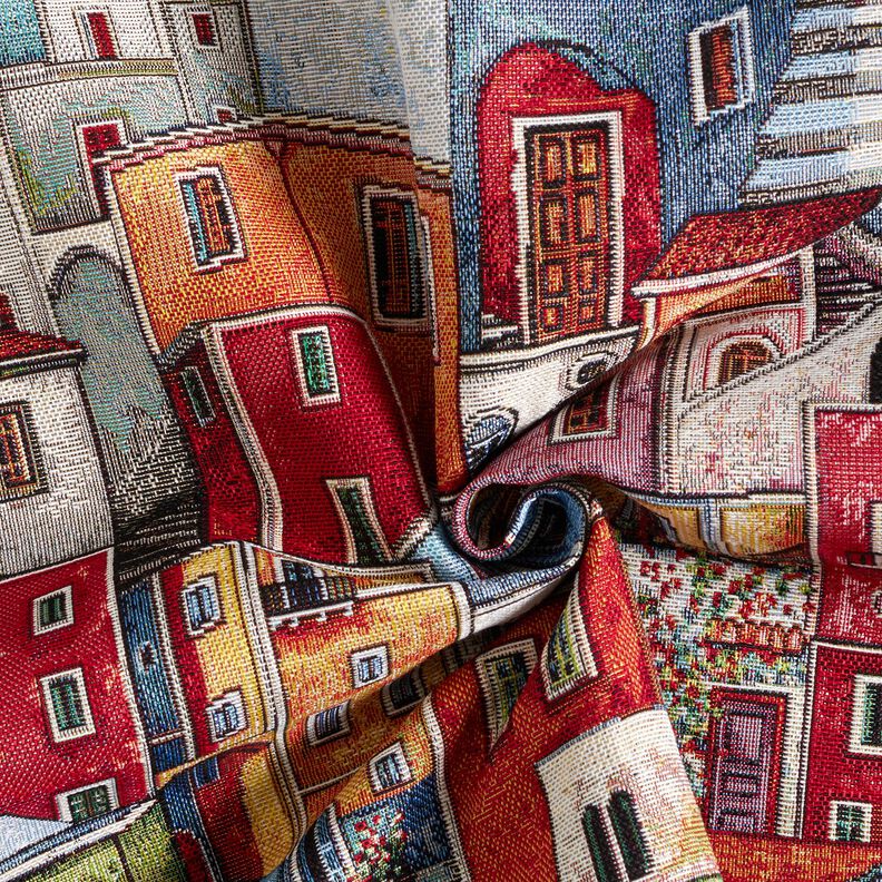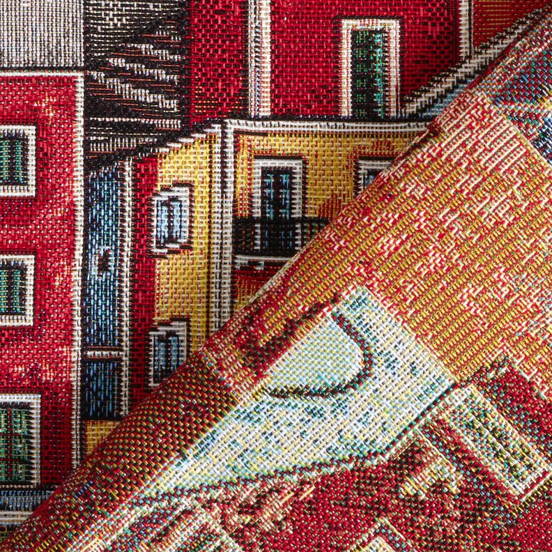 Sisustuskangas Gobeliini värikäs pikkukaupunki – karmiininpunainen/sininen
