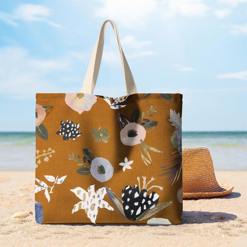 Sisustuskangas Puolipanama Suuret retrokukat – kinuski/vaalea khaki