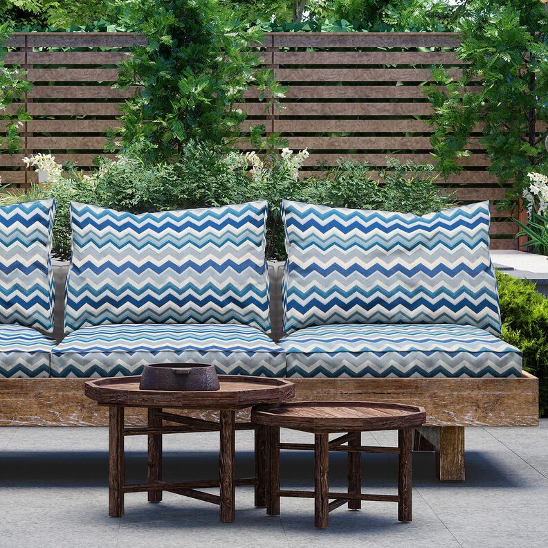 Tämä ulkokangas sopii ihanteellisesti alustaksi, tyynyihin ja pehmusteisiin puutarhan oleskelualueella.