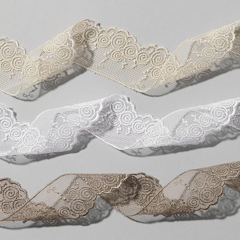 Tyylikäs, hieno pitsi, jossa kevyesti aaltoileva reuna.