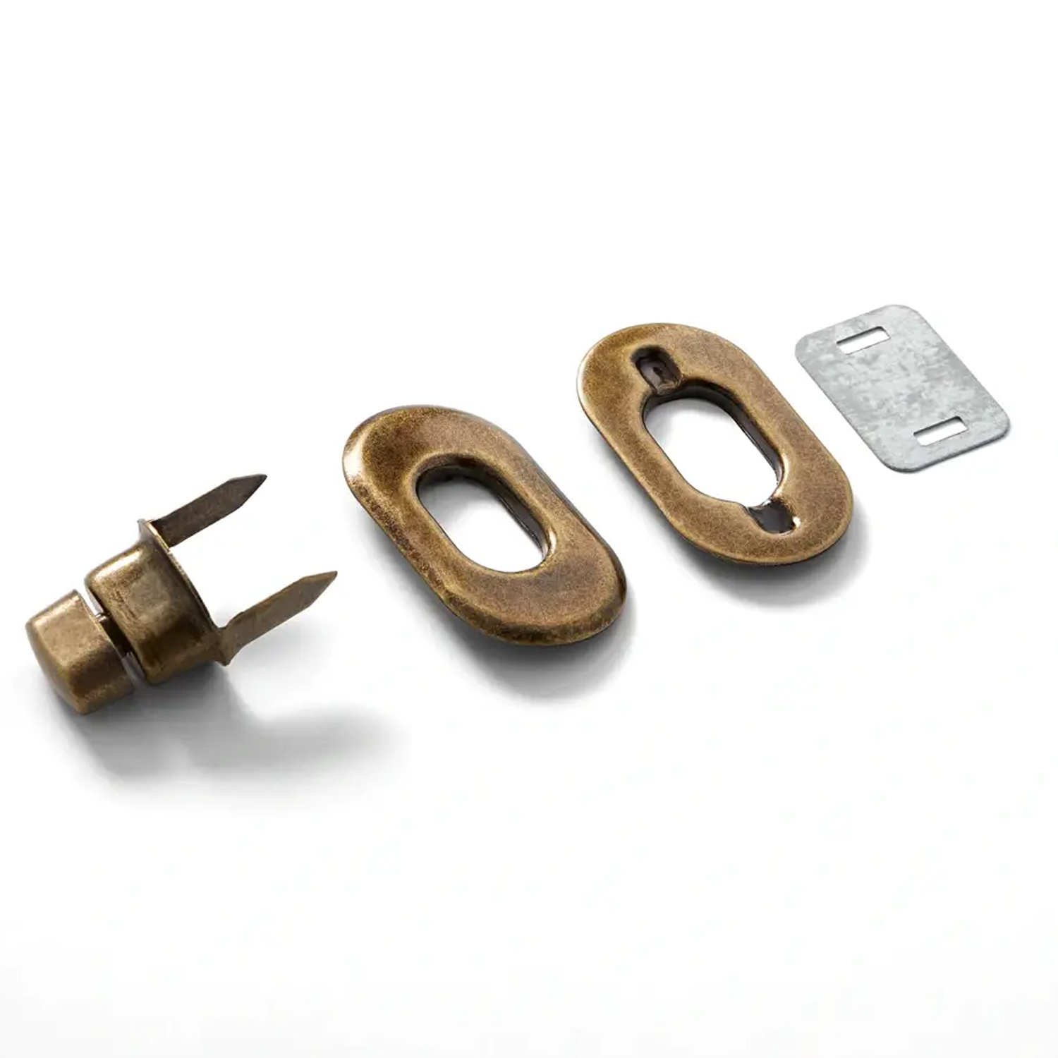 Prym-kierrekiinnitys tyylikkäästä antiikkimessingistä antaa laukuille, repuille, kytkimille tai takkeille laadukkaan ja ammattimaisen ilmeen hetkessä. Lämmin, hohtava metallinhohtoinen ja hienovarainen antiikkipintainen ulkonäkö sopii täydellisesti klassiseen, rustiikkiseen tai moderniin muotoiluun, ja se sopii mainiosti yhteen nahan, keinonahan ja tukevien kankaiden kanssa.