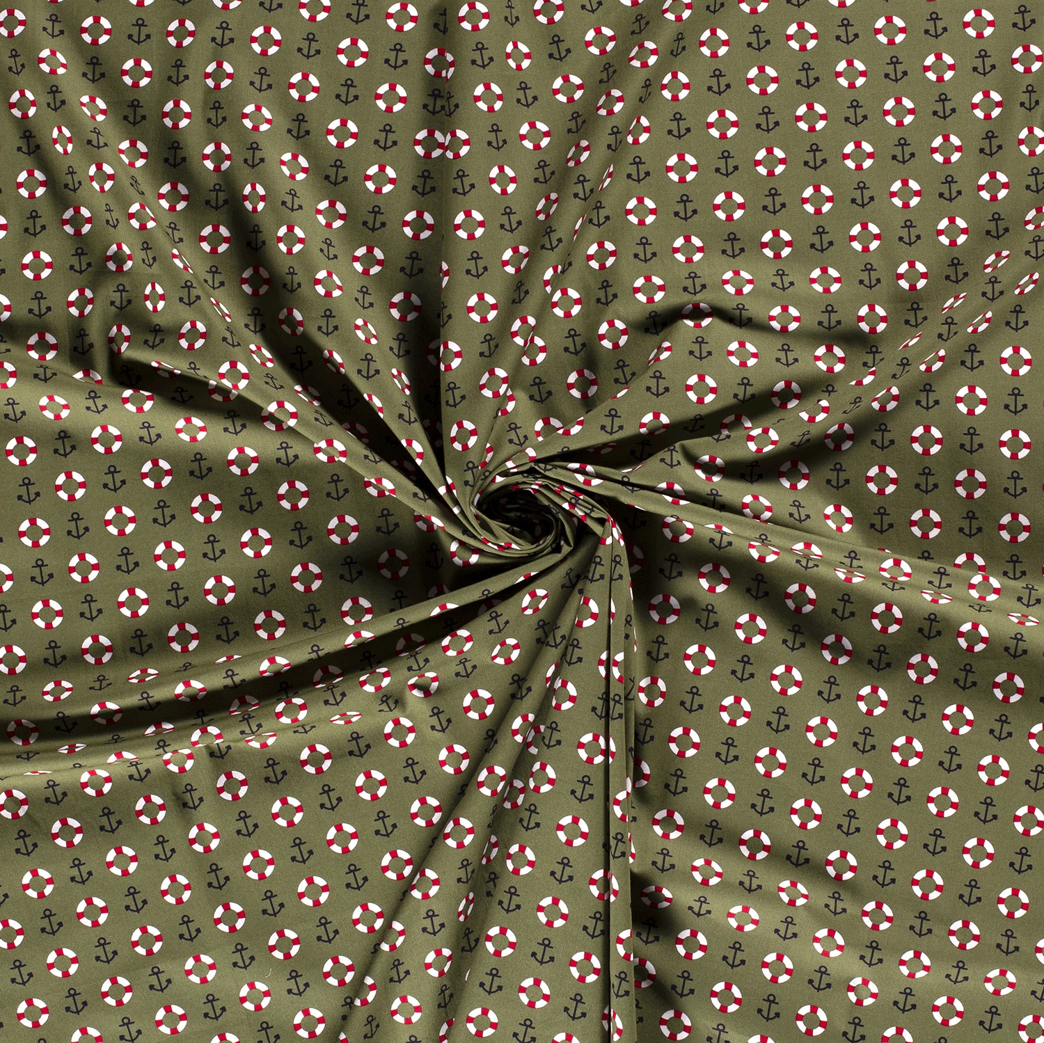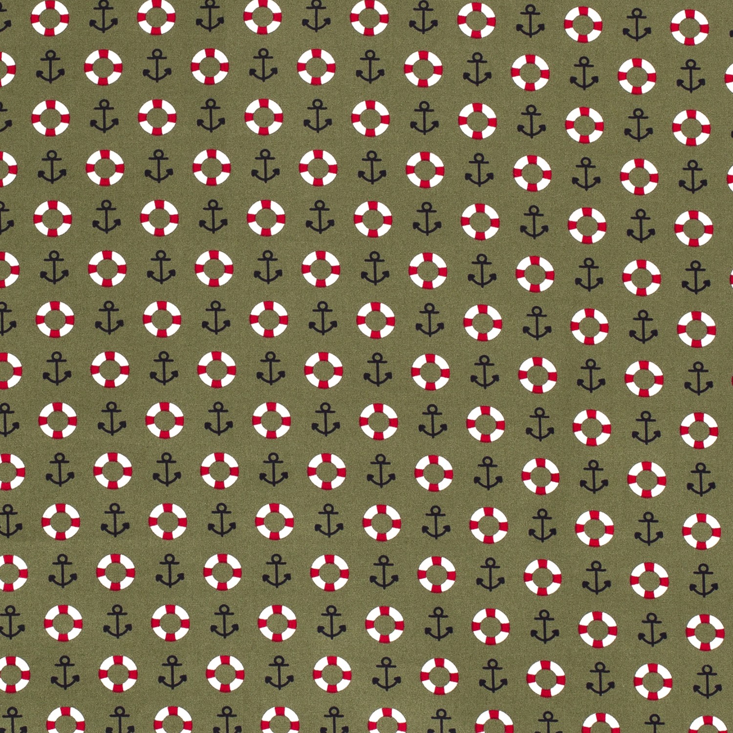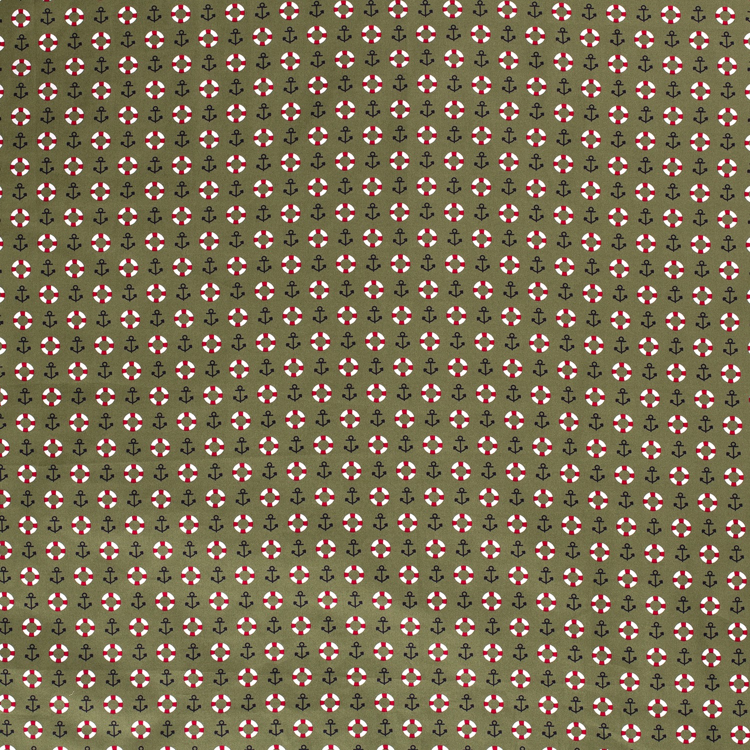 Tämä merellinen puuvillakangas tuo välittömästi lomatunnelman ompeluprojekteihisi: rentoon khakinväriseen taustaan on rivissä pieniä tummansinisiä ankkureita ja punavalkoisia pelastusrenkaita – kuin päivä merellä kangassa tallennettuna. Hienot, selkeästi painetut kuviot vaikuttavat moderneilta ja samalla viehättävän leikkisiltä.