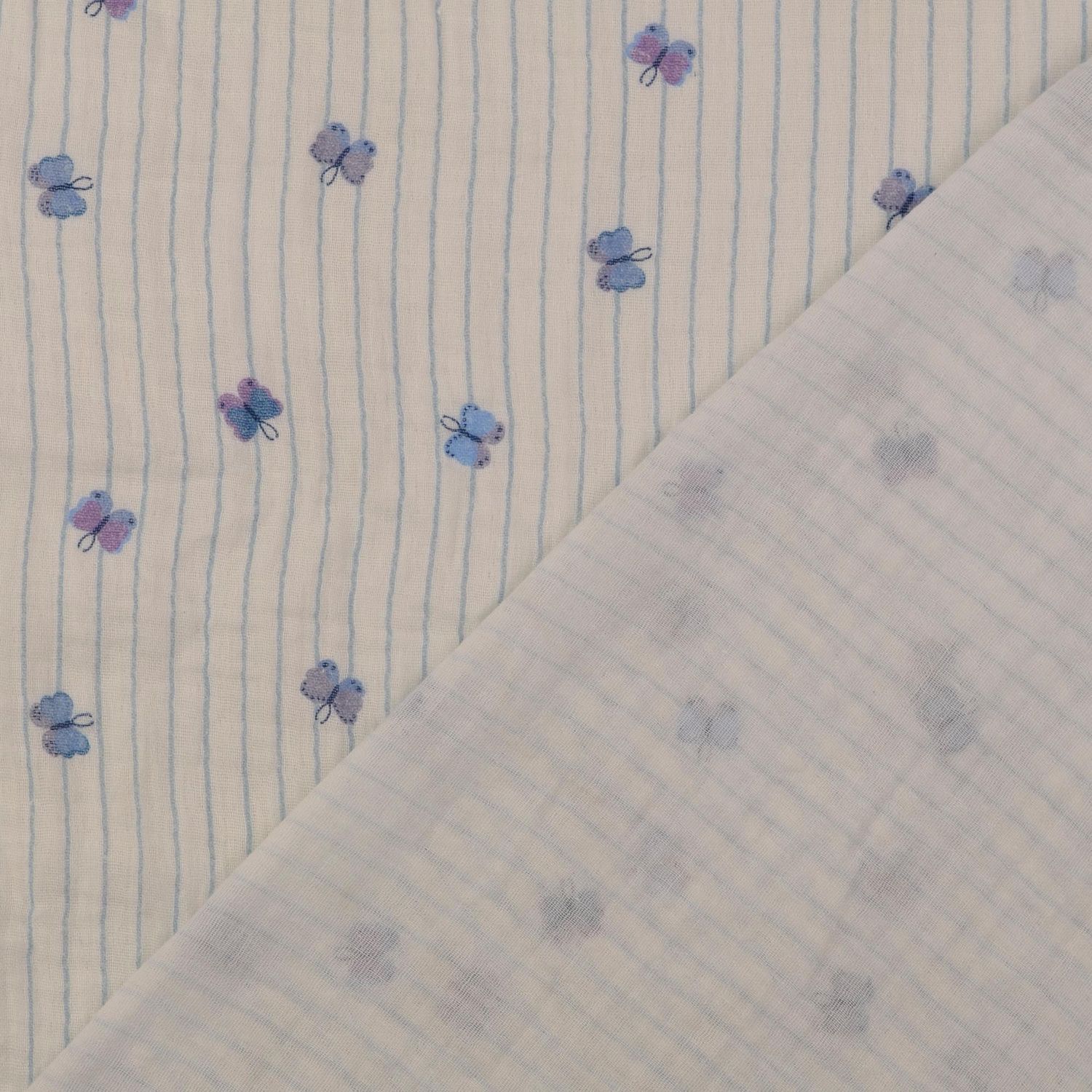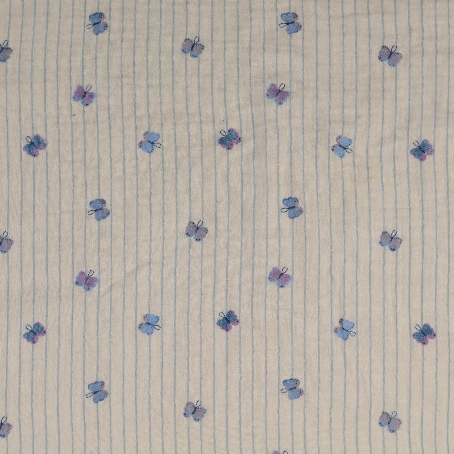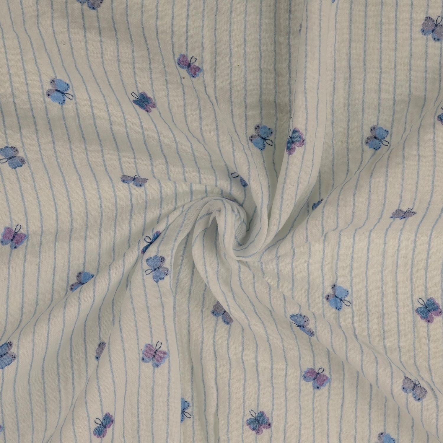Puuvillamusseli - Double Gauze Digipainatus Perhoset Raidat Offwhite Bleu