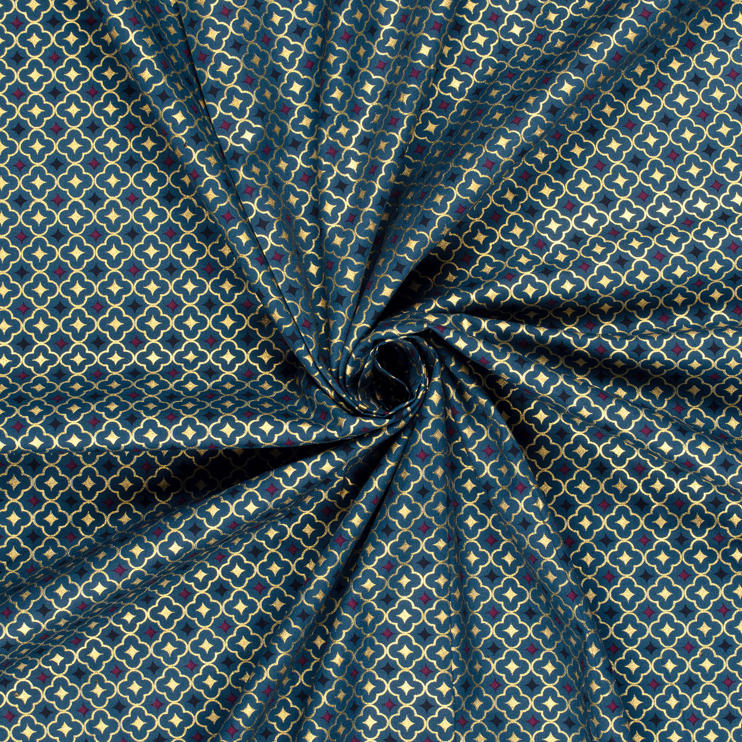 Orientin vivahdus ompeluprojekteihisi: Syvän petrolin päällä avautuu elegantteja, kultaisia ornamenttimalleja, jotka muistuttavat taidokkaita mosaiikkeja ja hienovaraisia mandaloita. Hienot linjat ja kaarevat muodot antavat arvokkaan vaikutelman ilman, että ne ovat päällekäyviä, ja tuovat jokaiselle projektille tyylikkään sävyn.
