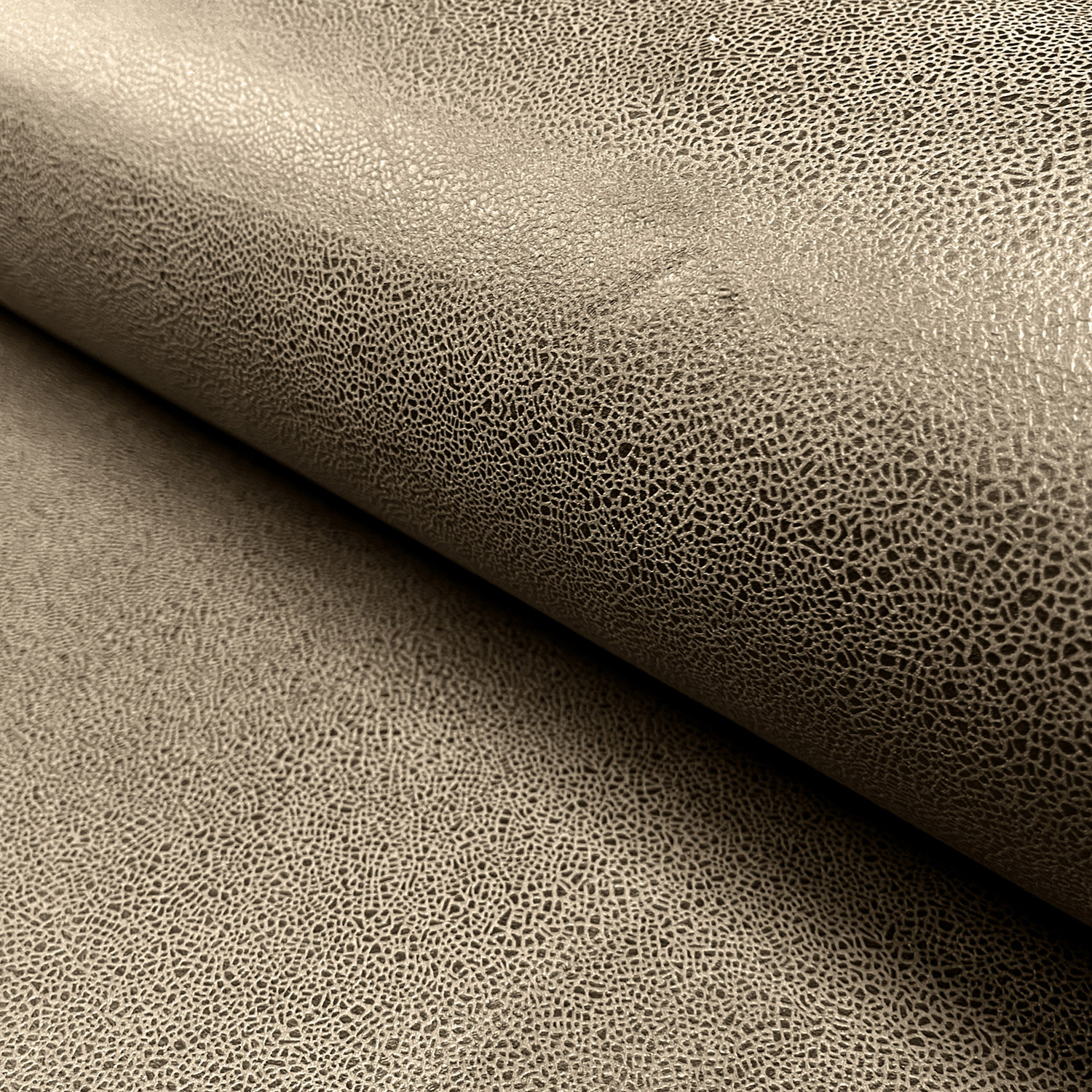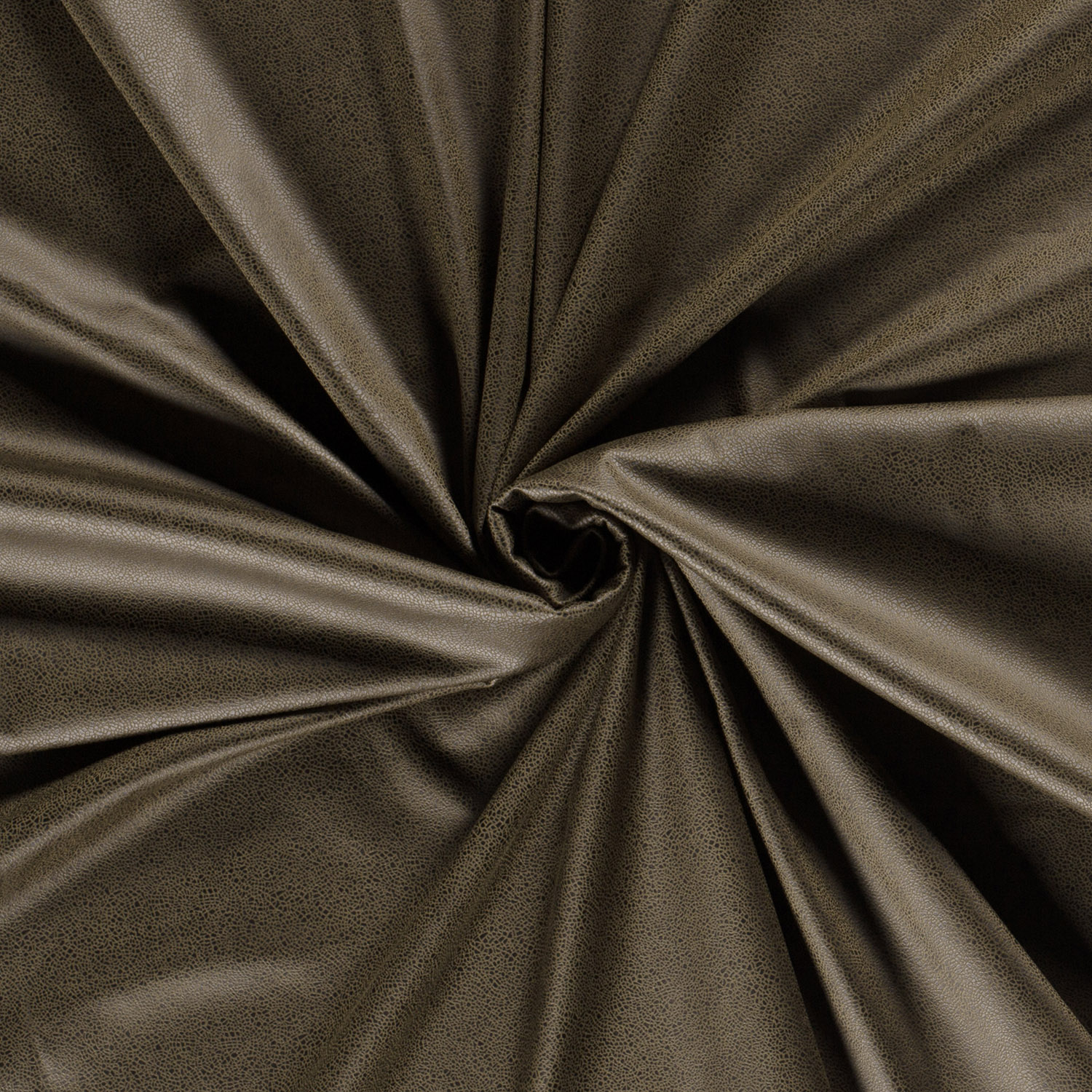 Tämä tyylikäs scuba, jossa on mokkanahkaa jäljittelevä pinta, yhdistää pehmeän tuntuman moderniin, metalliseen ilmeeseen. Khakinvihreä pohja näyttää luonnolliselta ja tyylikkäältä, kun taas hieno foliopainatus hohtavassa kullassa viimeistelee designin ylellisesti. Valon suunta vaikuttaa elegantteihin heijastuksiin, jotka antavat kankaalle erityistä syvyyttä ja eloisuutta.