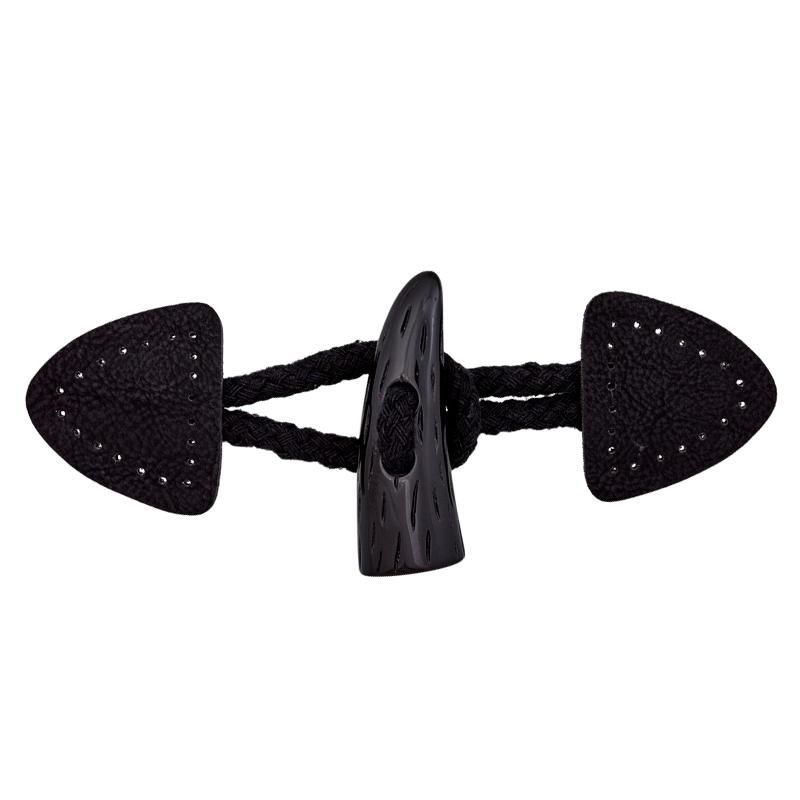 Kiinnike koostuu kahdesta näyttävästä, syvänmustasta keinonahkalaastarista, jotka kiiltävät hieman ja antavat mallille hienostuneen ilmeen. Keskellä on pitkulainen puun näköinen vääntökiinnike, joka luo kauniin kontrastin mustalle lämpimällä, tummalla värillään. Kiinnityslenkin loivasti kaareva muoto ja laastareiden huolellisesti ommellut reunat luovat laadukkaan ja ajattoman ilmeen.