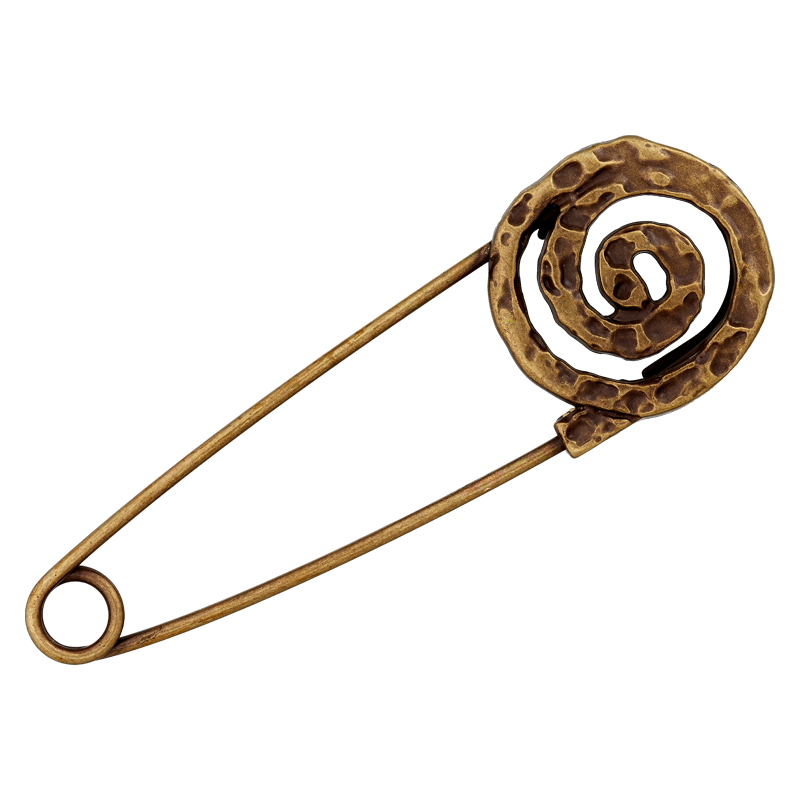 Tämä elegantti kilttipinssi antiikkimessingin näköisenä on todellinen katseenvangitsija missä tahansa asussa. Koristeellinen käärömuoto näyttää pieneltä taideteokselta: pehmeästi kaarevat linjat kiemurtelevat tyylikkäästi sisäänpäin, yhdistettynä metallin lämpimään, hieman antiikkiseen värisävyyn.