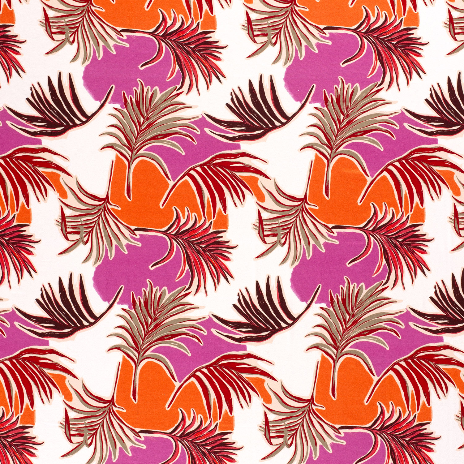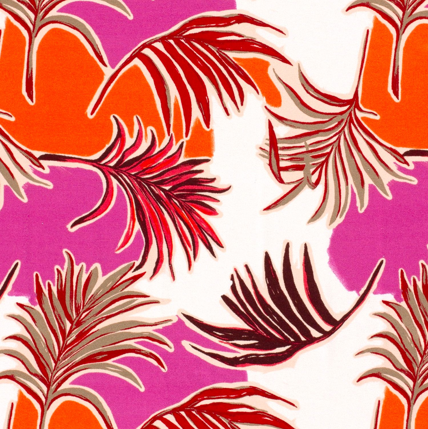 Kesäinen kevyt jersey, joka tuo heti mieleen lämpimät auringonsäteet ja tuulessa kevyesti keinuvat niityt: Kirkkaan valkoisella taustalla tanssivat hienot ruohojen varret hennon oranssin ja ruosteen sävyissä, joiden lomassa on pehmeitä beigejä sävyjä. Hienostuneet varret ja lehdet näyttävät piirretyiltä ja antavat kankaalle luonnollisen, elegantin keveyden.