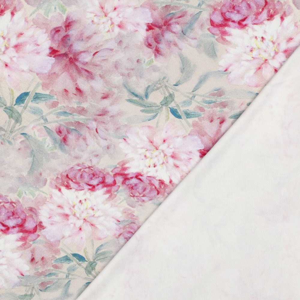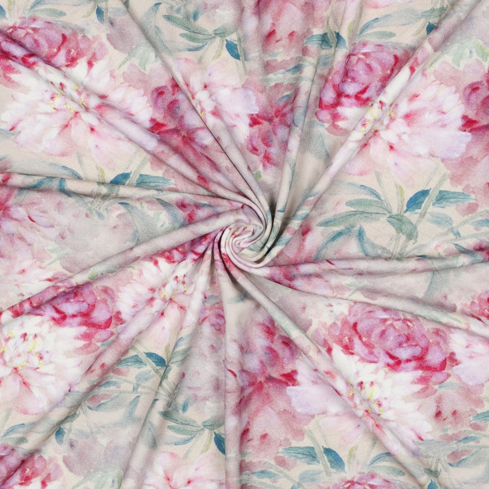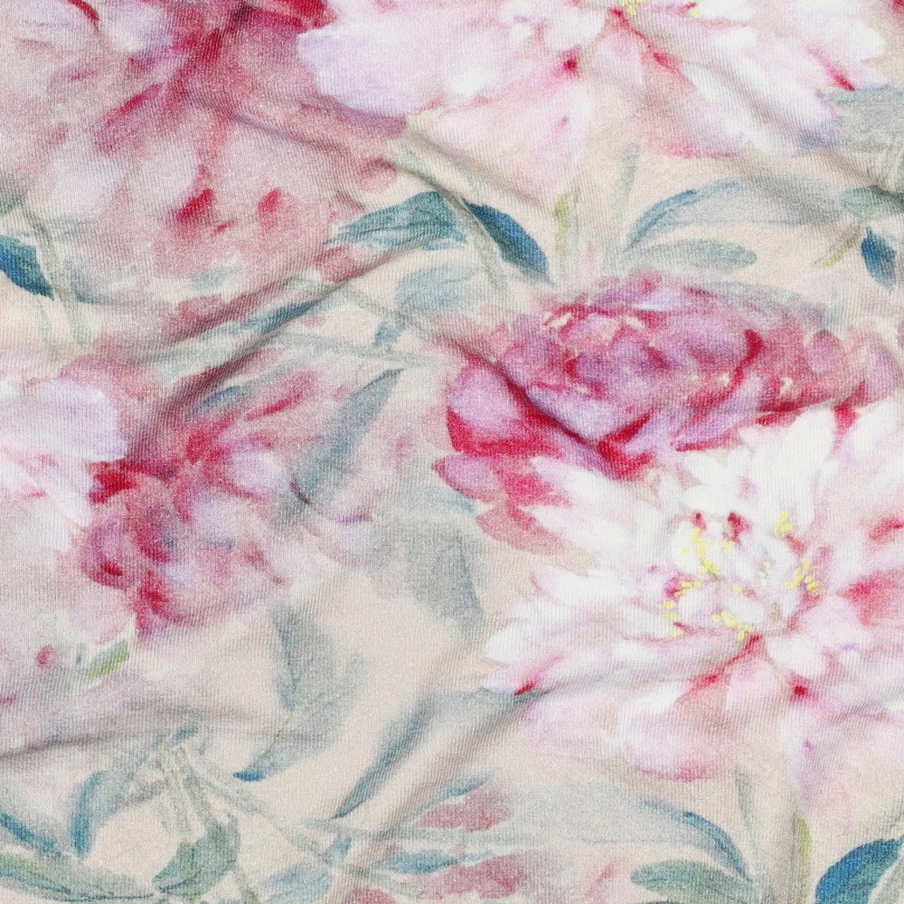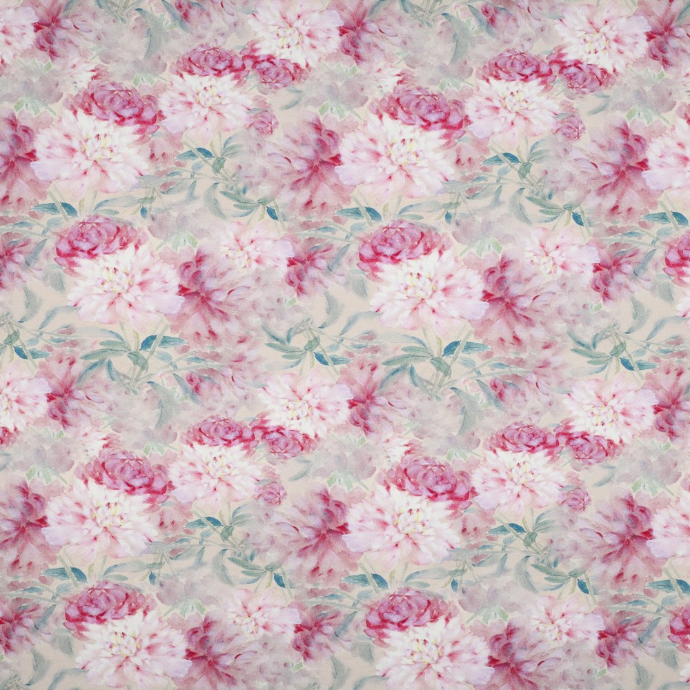 Herkän leikkisä ja ihanan feminiininen – tämä viskoositrikoo lumoaa unelmallisella kukkien digitaalipainatuksella vaaleanpunaisissa sävyissä. Hienot kukat eri vaaleanpunaisen vivahteissa kohtaavat pehmeät, harmonisesti sovitetut värit ja näyttävät kuin romanttinen vesiväripuutarha kankaalla.